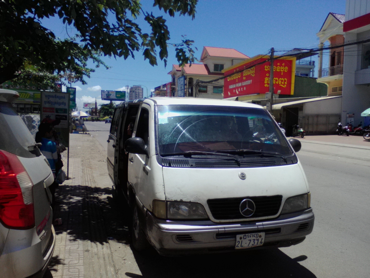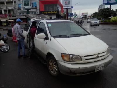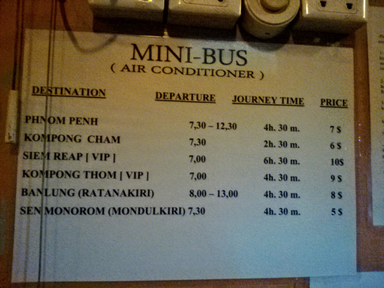 泊まっているゲストハウスでコンポンチャムへのミニバスをチェック。7:30出発の6ドル。町中にある旅行会社も同じ料金でした(他の目的地の料金は写真を参照して下さい)。お寺の向かいにあるローカルバスステーションで聞くとなんとコンポンチャムへは4ドル!(正確には15000R)。やはり2ドルの差は大きいのでローカルバスで行くことにしました。ローカルバスと言ってもワゴンの乗用車の乗合いタクシーです。おそらく乗合いタクシーの方がスピードが出せるので所要時間は少ないと思います。料金が安くて早く着く、ラッキーと言いたいところですが最大の難点は人数が集まらないと出発しないこと。実際に私は8:00にバスステーションに着き、すぐに乗り合いタクシーに乗り込みましたがこの時点では乗客は私は1人。そのあと荷物を積み込みに行ったり、人を迎えに行ったりで町中をぐるぐる回り、実質の出発時刻は8:50でした。確実に予定通りに行きたい方はツーリストバスを使った方がいいと思います。コンポンチャムへは所要2時間10分、キズナ橋のたもとにあるナーガ像が建つロータリーが終点です。