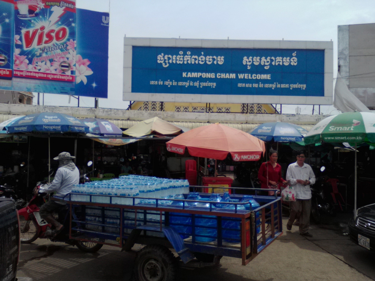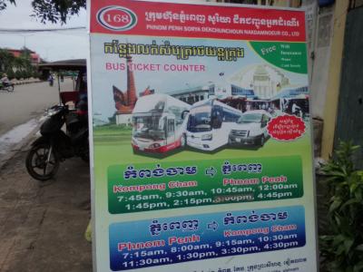 バスターミナルと言っても通り沿いのチケットオフィスです。各方面へのバスが出ていますが、プノンペン行きバスの出発時間は7:45,9:30,11:45,13:45,16:30、4.5ドル(18000R)、所要3h。このバスはコンポンチャム発ではなくクラチエ方面からやって来ます。プノンペンの到着場所はもちろんセントラルマーケット南側のソリアバスターミナルです。周辺にはいくつかのバス会社があり、料金が異なります。プノンペンへ一番安く行くにはナーガ像のあるロータリー近くにあるキャピトルツアーオフィスの先30m付近の路上で客待ちしている乗り合いワゴンです。キャピトルツアーのバスではないので注意!料金は3ドル(12000R)です。