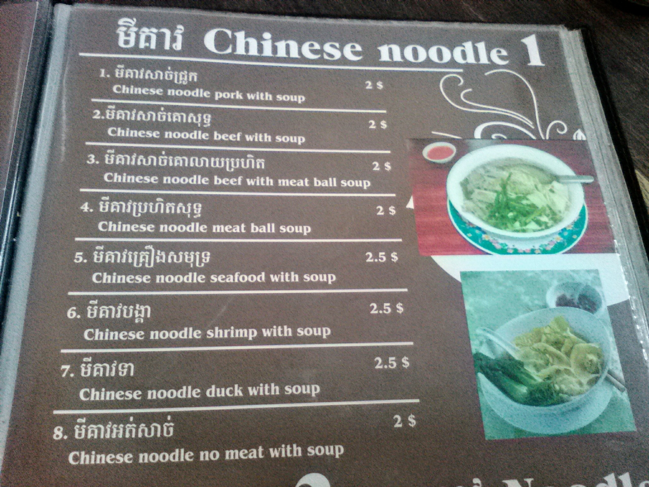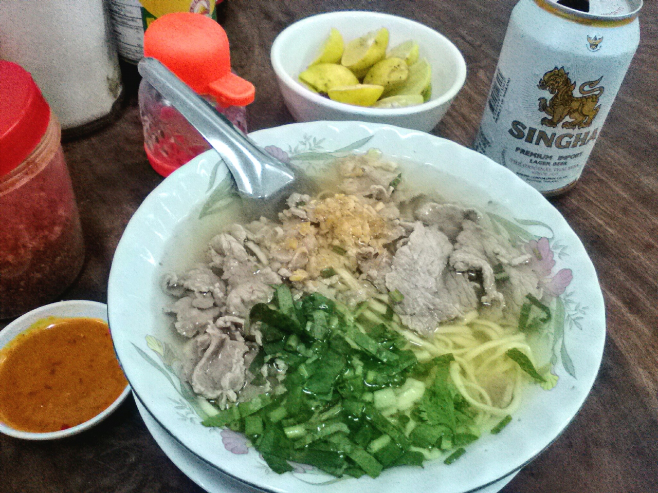 地図での場所はあっていますが看板がないのでわかりにくいです。店名にもなっているミーとは黄色い卵麺のこと、キウはワンタン。ミーキウはいわゆるワンタン麺のことです。で、牛肉入りのミーキウ・サイッ・コー(2ドル)を食べました。メニューでは「Chinese noodle beef with soup」です。ワンタンは2〜3個入っています。お味は…まぁおいしいですがいたって普通です。スープもやさしいお味。しょう油やチリなどが用意されていますが入れすぎ注意です。せっかくのダシが台無しになり何を食べてるのかわからなくなってしまうかも。ライムをさっとしぼったくらいでいいんじゃないかと思います。他にはフライドライスやフライドヌードルなどもあります。