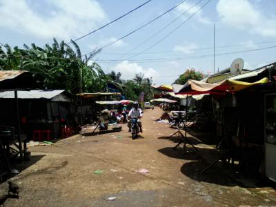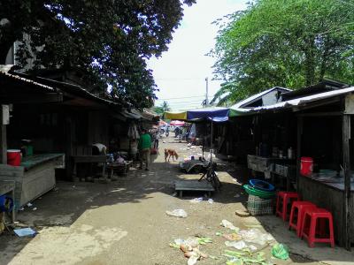 市場の正面入口は北側、その入口前にご飯屋さんが何軒か並んでいます。おかずの入った鍋が並んでいるのが目印です。値段を聞くとおかず1皿とご飯のセットで6000R。市場めしにしてはかなり高めです。で改めてご飯(だけ)はと聞くと1000R、おかずは3000R。なら4000でしょ?と問うと露骨に嫌な顔をされました。立ち去ろうとすると3000に…。典型的な外国人価格か勝手に大盛りのパターンです。おそらく地元民は3000Rで食べてます。最悪のめし屋です。