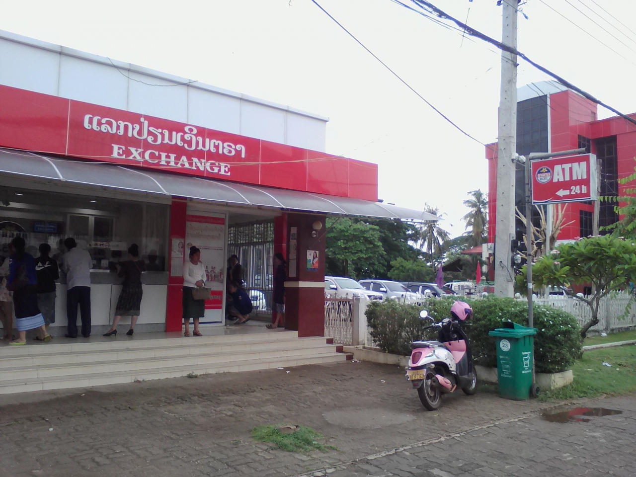 赤いど派手な大きな建物です。ATM(24H稼働)は敷地内のやや離れたところに両替コーナーと共にあります。1回あたりの引き出し限度額は150万kip(日本円で2万600円)、ATM利用手数料は2万kip(約275円)でした。支店に設置されているATMなのでカードが飲み込まれたりなどのトラブルがあってもすぐ対処してもらえるので安心して使えます(営業時間内に限られますが…)。
