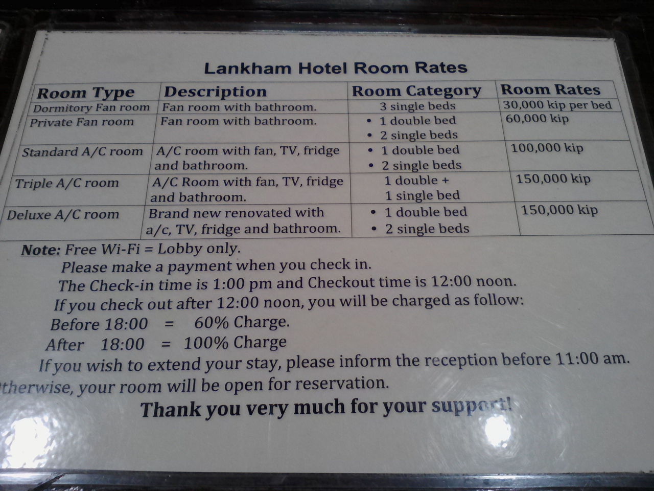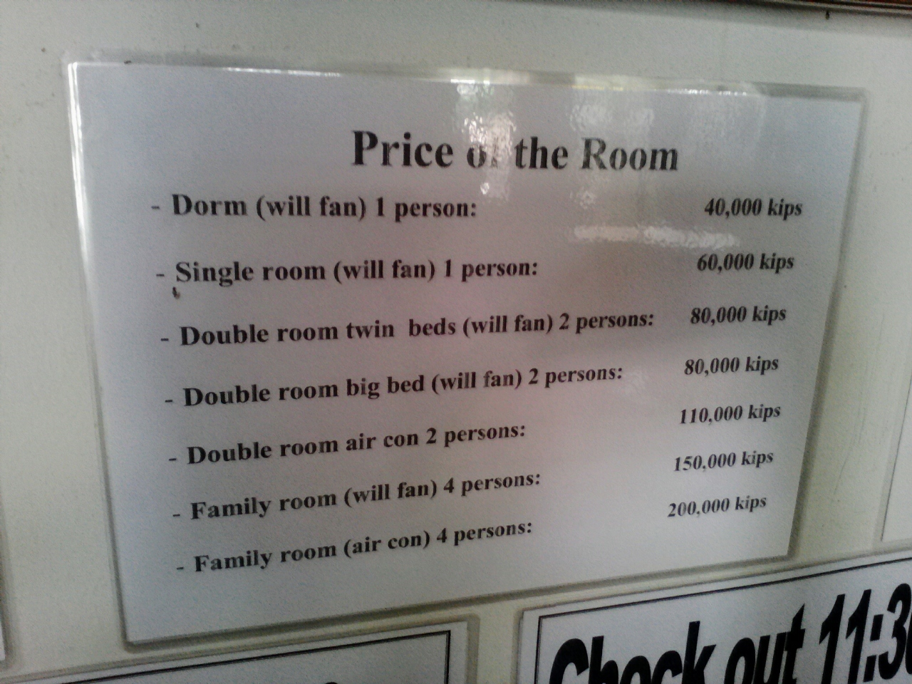 約4年ぶりに訪れてみましたが、まだちゃんと営業していました。お値段据え置きのファン(ダブル)5万kip、A/C(ダブル)7万kip。