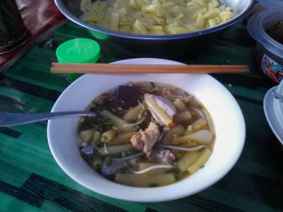 パクセー市街から東に1kmほどのところにあるローカル市場。セドン川にかかる橋からなら10分ほど13号線を歩くと右手にあります。とっても庶民的な小さな市場ですがひと通りのものは揃っています。このサイズの方が楽チンで便利。麺屋台も2つのみです。一方で「カロニー」を食べました。マカロニのようなものを使ったこれも立派な麺料理です。なぜマカロニーではなくカロニーなのかはわかりませんが…。お味は…まあ普通ですが1杯5000kipです。この安さは庶民的な市場ならでは、ダオファン市場ではこうはいきません。歩いて10分、行かない手はありません。やっぱり朝のほうがいいと思います。