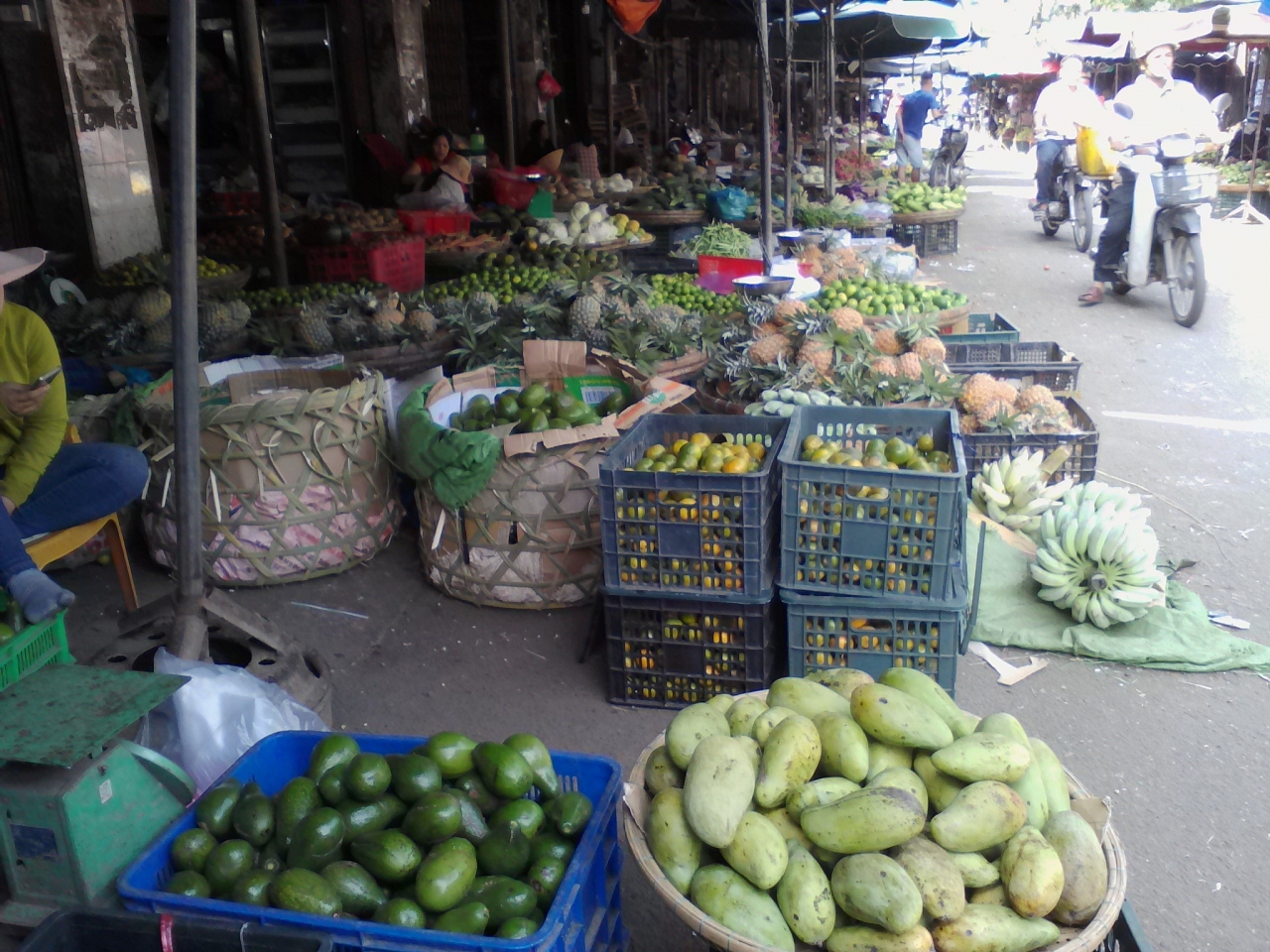 ドンバ市場の裏手にある露店の青果売り場で果物が安く買えます。例えばマンゴー、もちろんサイズや種類や熟度具合などで値段は変わりますが1kgで1万ドン〜2.5万ドンくらい。ここの売り場はおばちゃん達が家で採れたものも持ってくるのでそれが狙い目です。粒がそろっていなかったり、見た目がきれいでなかったりしますが自分で食べる分には関係ありません。市場内でも露店と同じようなマンゴーが売られていますが値段は倍です。明らかに外国人料金。交渉すれば少しは安くなるかもしれませんが面倒くさいので関わらないほうがいいです。果物買うなら市場裏手の露店です。