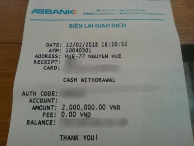 とあるネットの情報でAB BANKのATM手数料は無料と書いてあったので確認してみたところ実際に無料でした。※諸条件はわかりませんがATMの利用手数料としては何も引かれていませんでした。レシートの写真参照。ただし、マスターカード、JCB、アメックス、ダイナースカードは2万ドンの手数料がかかるとの表示がありました。VISAは無料。引出し上限額は1回につき200万ドンです。