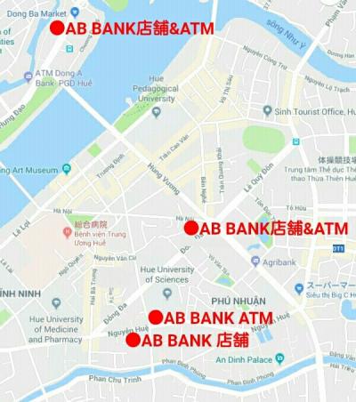 店舗とATMの場所は写真の地図の赤丸です(他にあるかは未確認)。ドンバ市場の向かいの店舗にはATMがありますがもう一方の店舗にはなく、近くの交差点の角にあります。