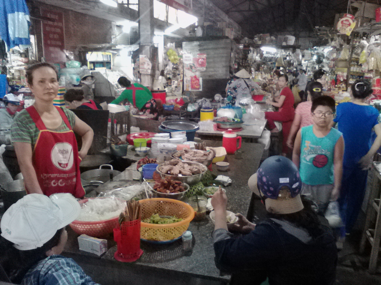 橋を渡り最初の三差路を左折すれば島の繁華街です(と言ってもかなりのんびりしていますが…)。コムヘンを出す屋台や食堂が並んでいますが昼頃に行ったせいか多くの店がすでに閉まっていました。といっても開いている店はありますのでご心配なく。けど朝に行ったほうが賑やかかもしれません。昼飯に「HOA DONG」というレストランでコムヘンとブンヘンを一杯づつ食べました(各1万ドン)。