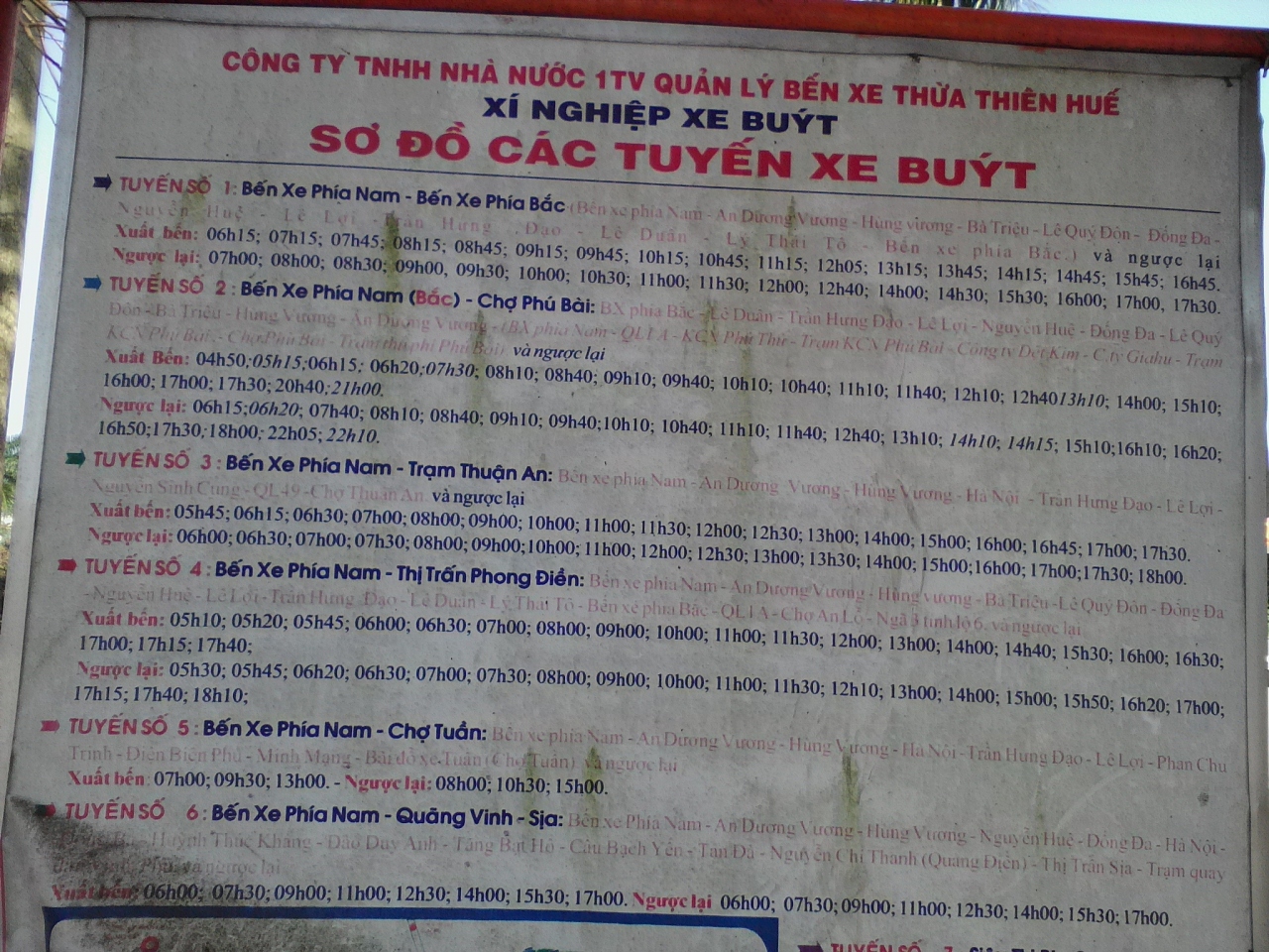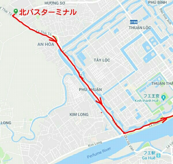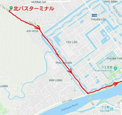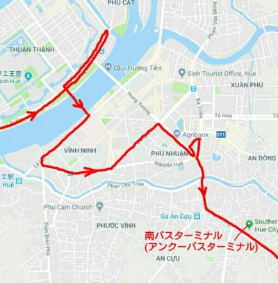 ルートの詳細は北バスT、Ly Thai To、Le Duan(フォン川の手前を左折)、Tran Hung Dao(ドンバ市場まで行きUターン)、フースアン橋、Le Loi、Nguyen Hue、Dong Da、Hung Vuong、Big Cの前でUターン、Big C裏を回り込み再びHung Vuong、南バスT前で降りました。ここまで乗って1万ドン。バスはそのまま南下しフーバイ(空港)を通りランコー(ビーチ)まで行きます。ちなみにBig C前からランコーまでは3万ドンです。もちろん逆のルートで南バスTから北バスTまで行けますがルートが若干異なるかもしれません(未確認)。- 旅行時期