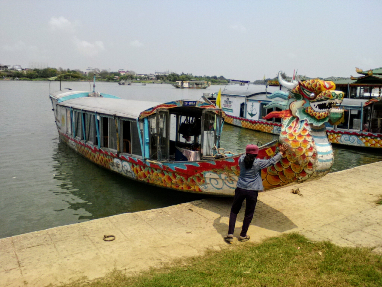 チャンティエン橋の下流側の遊歩道はドラゴンボートの船着き場になっていて歩いていれば必ず声をかけられます。クルーズの代表的なコースはティエンムー寺への往復1.5h(寺見学の待ち時間含む)。料金は1人20万ドンと言われることもありますが相場は15万ドンほどでしょうか。たまたま居合わせた旅行者とシェアすることもできるので、その場合は交渉すれば10万ドンにしてくれる場合もあります。さら交渉すればもっと安くなることもあります。船側は何人の場合でもさほど経費は変わらないのでそれを逆手にとれば有利に交渉できます。2人で16万ドンで乗ることができました。