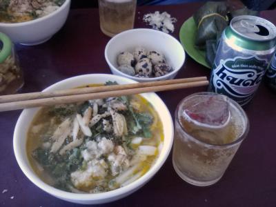 店名にもなっている「Cua」はカニという意味。カニ肉入りのバンカン屋です。一杯25000ドン。ちょっと量が少ないのでおやつ代わりにでもイケます。テーブルの上にはうずらの卵(1個1000ドン)やネム(1個5000ドン)が置かれており、これらをつまみにフーダビール(350缶12000ドン)をやった後のバンカンはたまりません。カニ肉の風味が出ていてクセになりそうなうまさです。ランチにおすすめです。