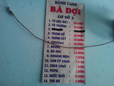 3年ぶりに訪れましたがお値段据え置き。メニューは一つしかないので特別(TO DAC VIET)20000ドンか普通(TO THUONG)15000ドンのどちらかを選ぶだけです。小(TO NHO)はメニューから消されていました。前回も今回も“特別”を注文したので“普通”との違いがよくわかりません、あしからず。味はパーフェクトではっきり言ってうまいです。しかし量が少ない…、まあ足りなければ2杯注文すればいいだけなんですが…。テーブルに出されたうずらの卵(茹で)は1個1000ドン。おすすめのバンカン屋です。