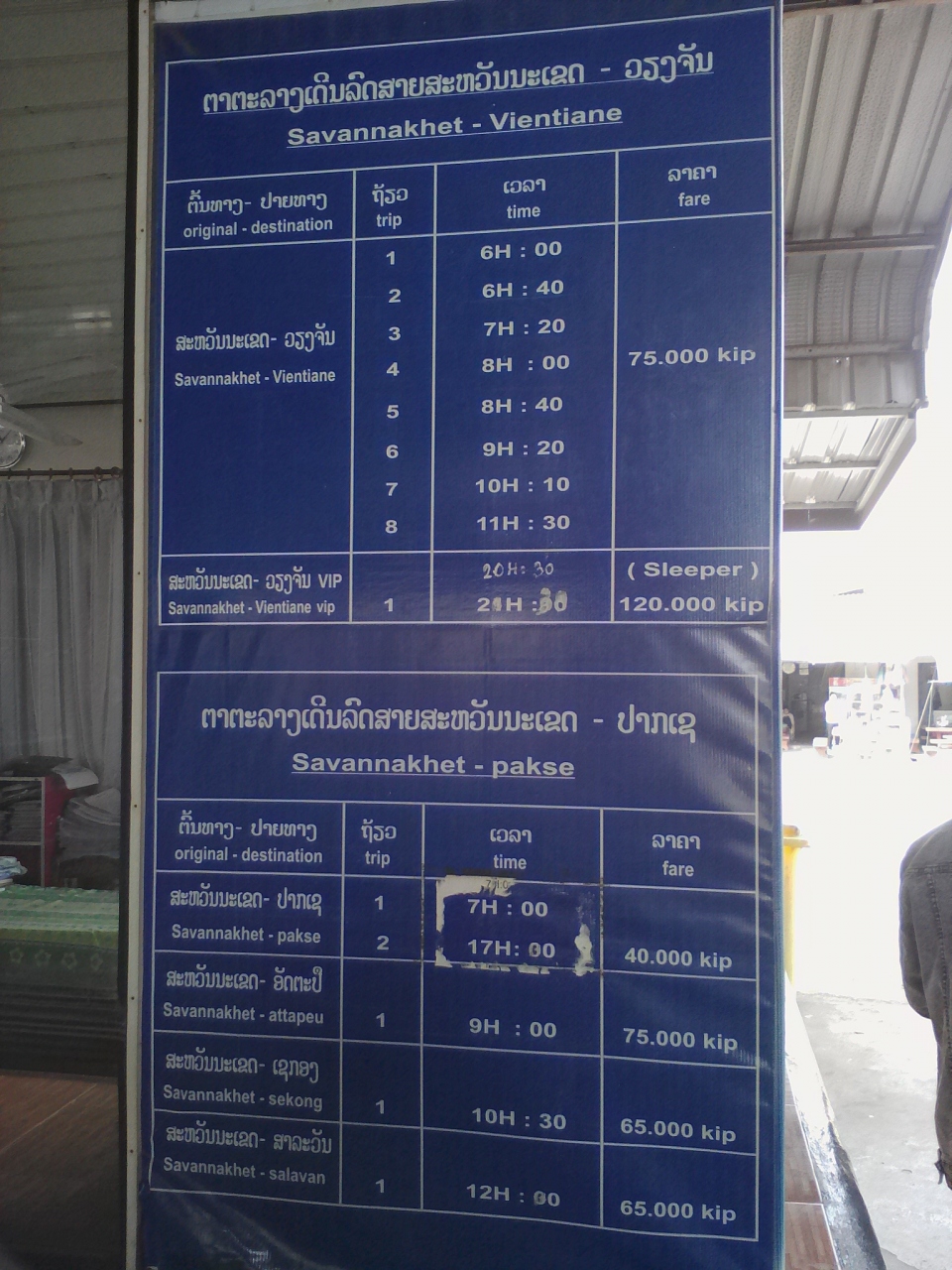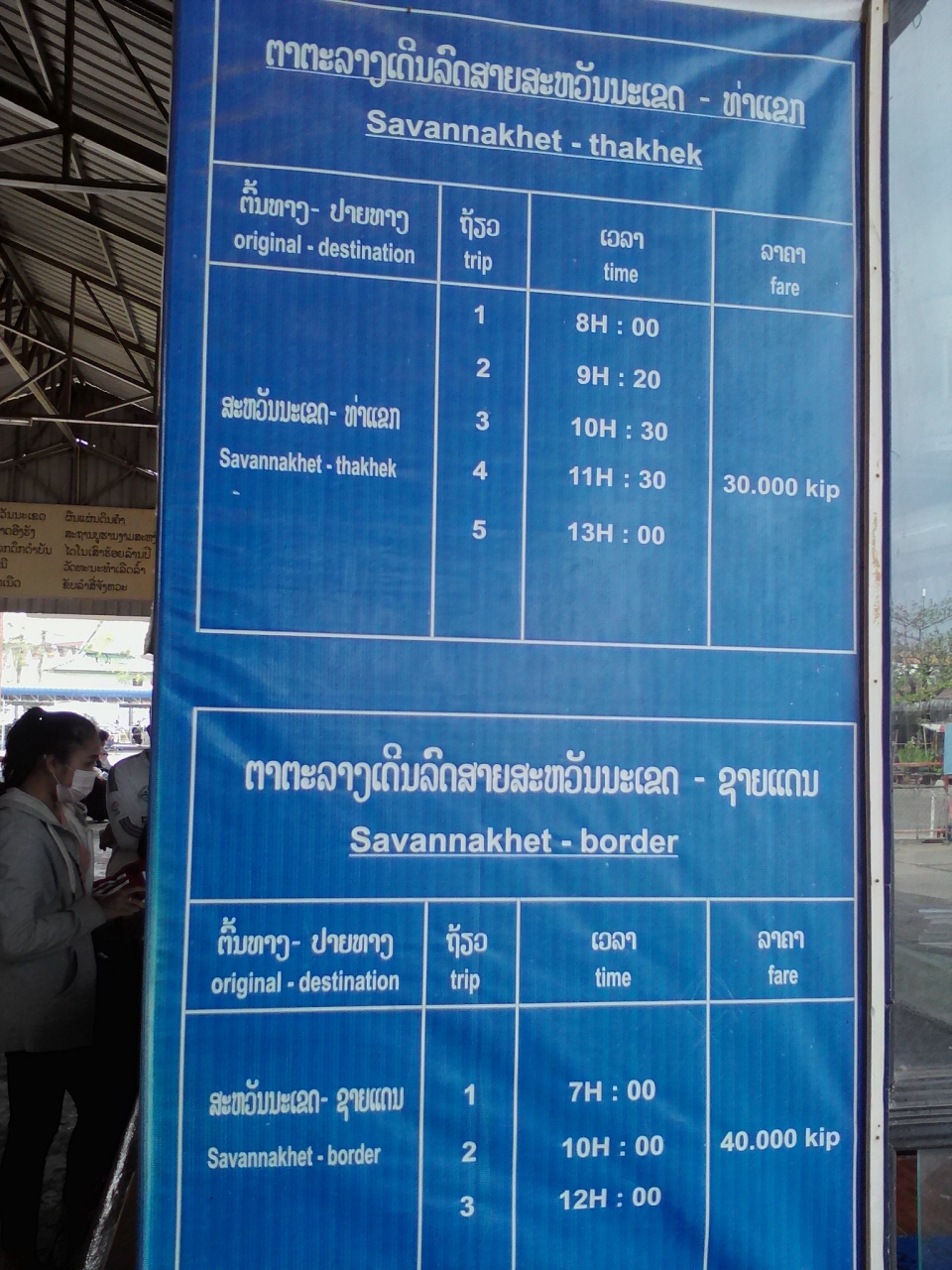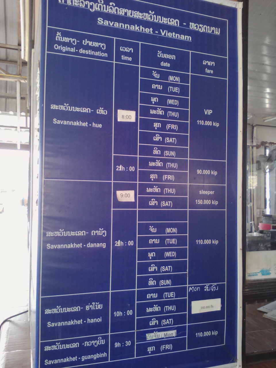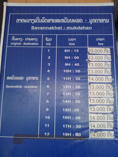 サワンナケートからはビエンチャン、タケク、パクセー方面(アッタプー、セーコーン、サラヴァン)、ムクダハン(タイ)、ベトナム(フエ、ダナン、ハノイなど)、ベトナム国境へのバスが出ています。出発時刻、料金は写真を参照して下さい。