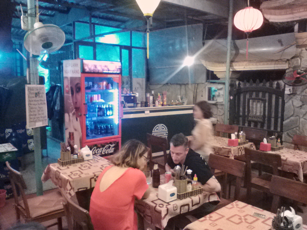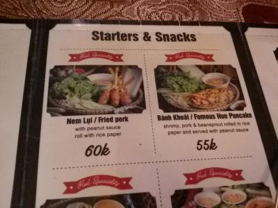 100%ツーリストレストラン。欧米、アジアの観光客ばかりです。一人だったら絶対行かない店ですが人から誘われたので仕方なく行くことに…。ネムルイ(6万ドン)、空芯菜の炒め物(4.5万)、バインベオ(4.5万)、イカのフリッター(13万)、バナナの花のサラダ(6.5万)などを注文しましたがいい値段のわりにはどれも量が少なく無国籍料理状態。せっかくベトナムまで来てこんなのを食べるのは悲しすぎます。フーダビールも1本1.7万ドン。ローカルな店に行けば8000か1万です。まったく行く価値のない中途半端なレストランです。