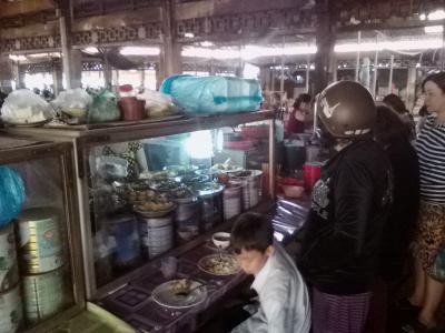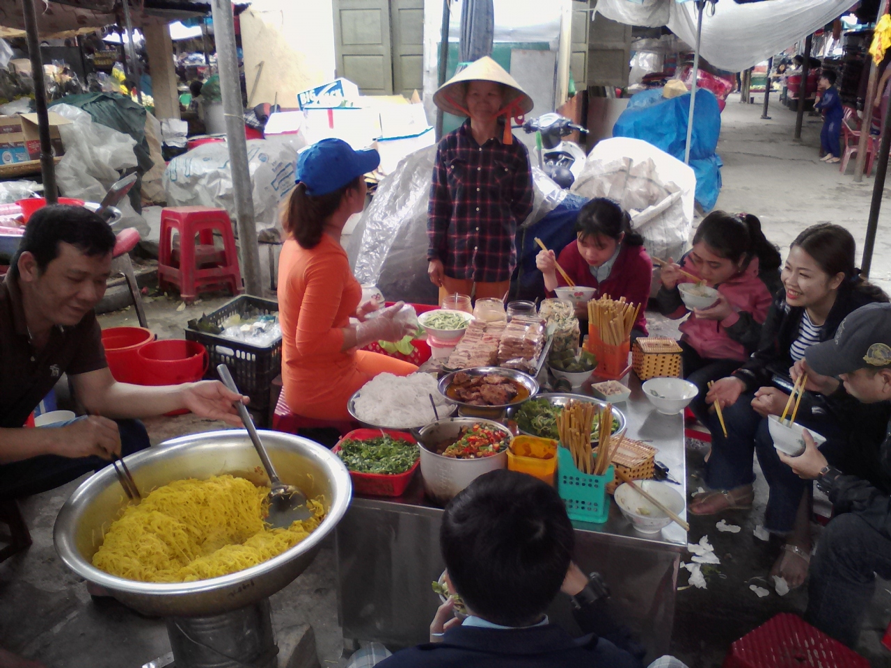 旧市街タイロック地区にある大きな市場。ドンバ市場のように外国人旅行者の姿はなく、強引な客引きもされません。内部はとってもローカルでディープな世界が広がっています。もちろん飲食コーナーもあり市場めしが食べられます。やや奥側にあるメインの建屋の奥側(裏手の入口の近く)です。ブンなら10000ドン、コムビンザンならご飯に何品かおかずを乗っけてもらって15000ドンから食べられます。値段によってご飯、おかず大盛りにもできます。味ももちろんおいしいです。薄暗い中で地元の人達と食べるのもなかなかいい体験だと思います。旧市街散策のついでにぜひ立ち寄ってみて下さい。