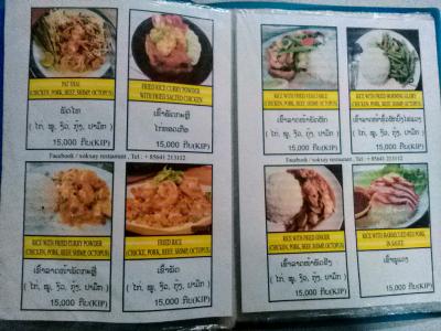 タイとラオスの食べ物は基本同じですがやはり似て非なるもの。タイから来た方ならタイ飯を懐かしく思う時もあるかと思います。そんな時にぴったりのタイ料理レストランです。メニューは数多くタイの食堂よりも充実しているくらい。ご飯+おかず系や麺料理なら15000kip、1品料理なら20000kipです。タイよりも高いですがまあここはラオス。何を食べようか迷いましたが、ラオスではなかなか食べる機会が少ないカオパット(焼き飯)にしました。鶏、豚、牛、エビ、イカ、どれをチョイスしても同じ値段。驚いたのは注文してからあっという間に運ばれてきたこと。レンジでチンしたくらいの速さです。それはないと思いますが…。味も美味しかったです。ただ水差しはいくつも置かれているのにこの水は飲めないと。ツーリストだからでしょうか1本3000kipのペットボトルを出されました。ちょっと感じ悪いです。しかしおすすめのレストランです。ビアラオ大ビンも10000kipで飲めます。