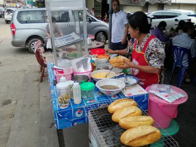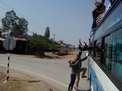 サワンナケートからラオス側国境の町デーンサワンまでのバスは1日3本7:00,10:00,12:00(40000kip)。7:00のバスは10分遅れで出発。8:00にビエンチャンーパクセーを結ぶ国道13号線上にあるセノに到着。ここで皆、ガイヤーンやカオニャオなどの朝飯を購入。ここで買うと高くつくので私は朝、サワンナケートの町中で買っておきました。店にもよりますが5:00から開いているところもあります。バスステーションでも買えます。