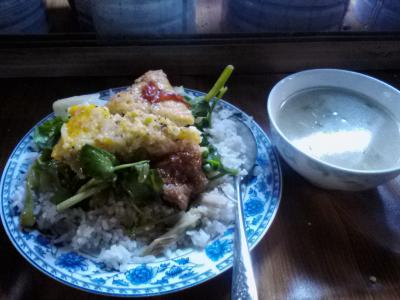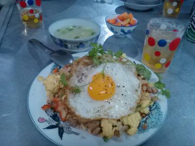 で、コム・チエン・タップ・カム(具材いろいろチャーハン)35000ドンをオーダー。豚肉や卵が入っていますが贅沢にもさらに追加でオップ・ラ(目玉焼き)7000ドンをのっけてもらいました。しめて42000ドン〜。スープも付いて味は文句なくおいしいです。