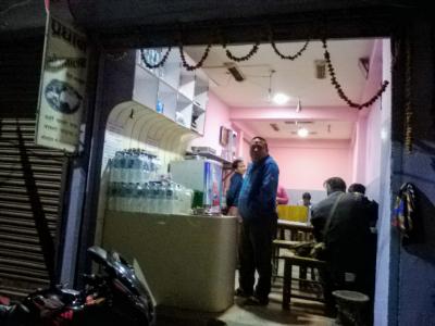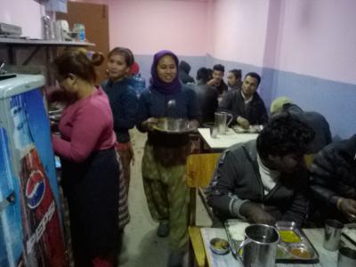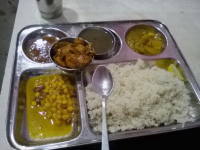 タヒティチョーク周辺は安めし屋の宝庫。他にもそういう場所はたくさんあると思いますがタメルから近いぶん、節約旅行者には利用価値大です。私のお気に入りのうちの一つをご紹介したいと思います。ストゥーパの前の道をチェトラパティ方向へ50mほど行った右手にある食堂です。名前は「プラダン・ボジャナラヤ」。一応看板は出ていますがネパール語です。わからなければ人に聞くか写真を参考にして下さい。ダルバートが食べられます。メニューはベジ、チキン、バフ(水牛)のみ。どれかを言えば運ばれてきます。内容はライス、ダル、サブジ(1種か2種)、アチャール、そしてチキンかバフ。シンプルが故にこれがうまい!ちょっといいレストランは油ギトギトですがここのはさらさらいくらでも食べられます。で驚きなのが値段。ベジが100Rs、チキン,バフが150Rsです。なんと肉以外はおかわり自由の食べ放題。やっぱおすすめはチキンです。毎日通える店です。