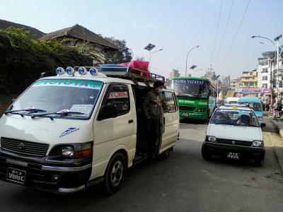 ラーニポカリの北側にあるジャマルバス停からバスに乗りました。バス前面に書かれている行き先表示はネパール語のみなので車掌に確認してから乗車を…。「コパングンバ」と行った方が通じやすいです。所要約1時間、25Rs。途中、ボダナートへ分かれるリングロード上で客待ちで20分ほど停まりました。