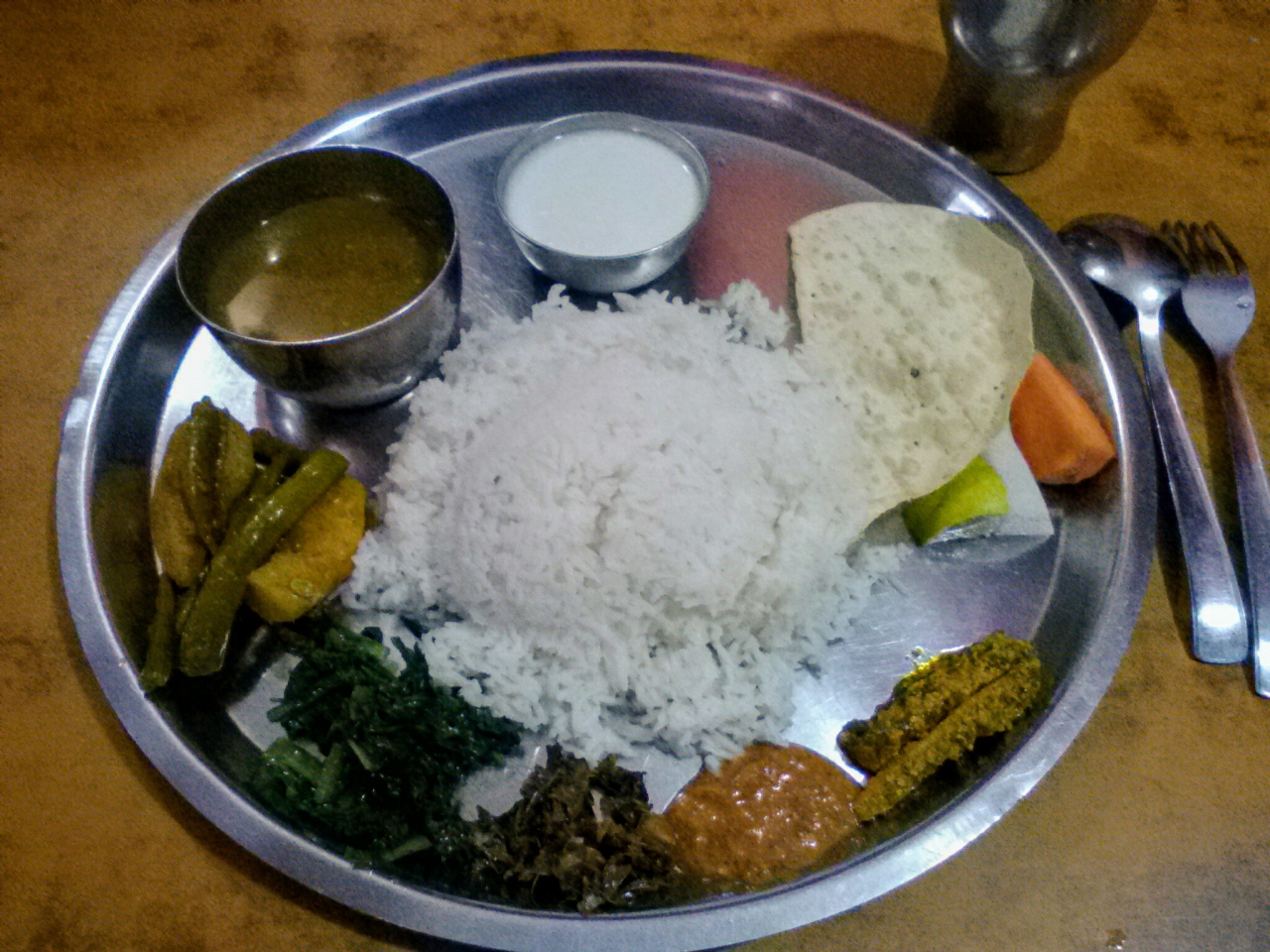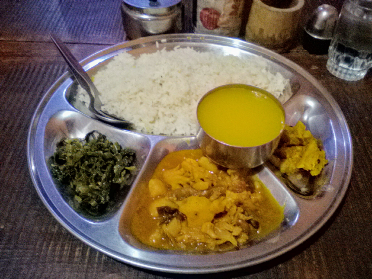 ダルバートの大人気店。メニューは3つのみ。ベジ(220Rs)とチキン(350Rs)、マトン(350Rs)。とてもお得な値段設定なのでせっかくならチキンかマトンをおすすめしますが節約型の旅行者である私はベジをオーダー。その辺のツーリスト用の安レストランではないおしゃれな盛り付けです。タルカリ(おかず)の種類も多いし、ダルにコクがありとてもおいしいです。ヨーグルト、せんべい、生野菜以外はおかわり自由です。ビールもあります。