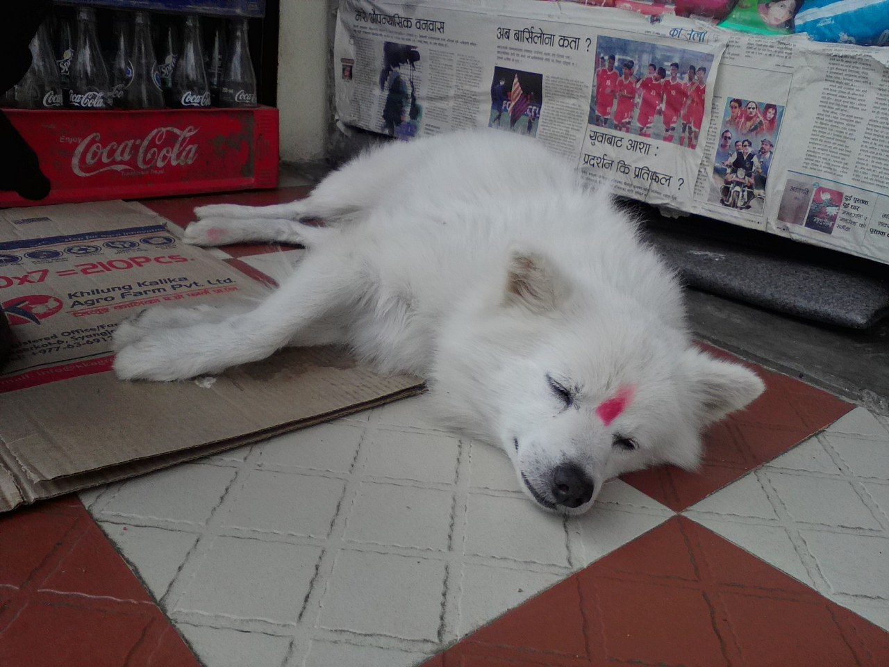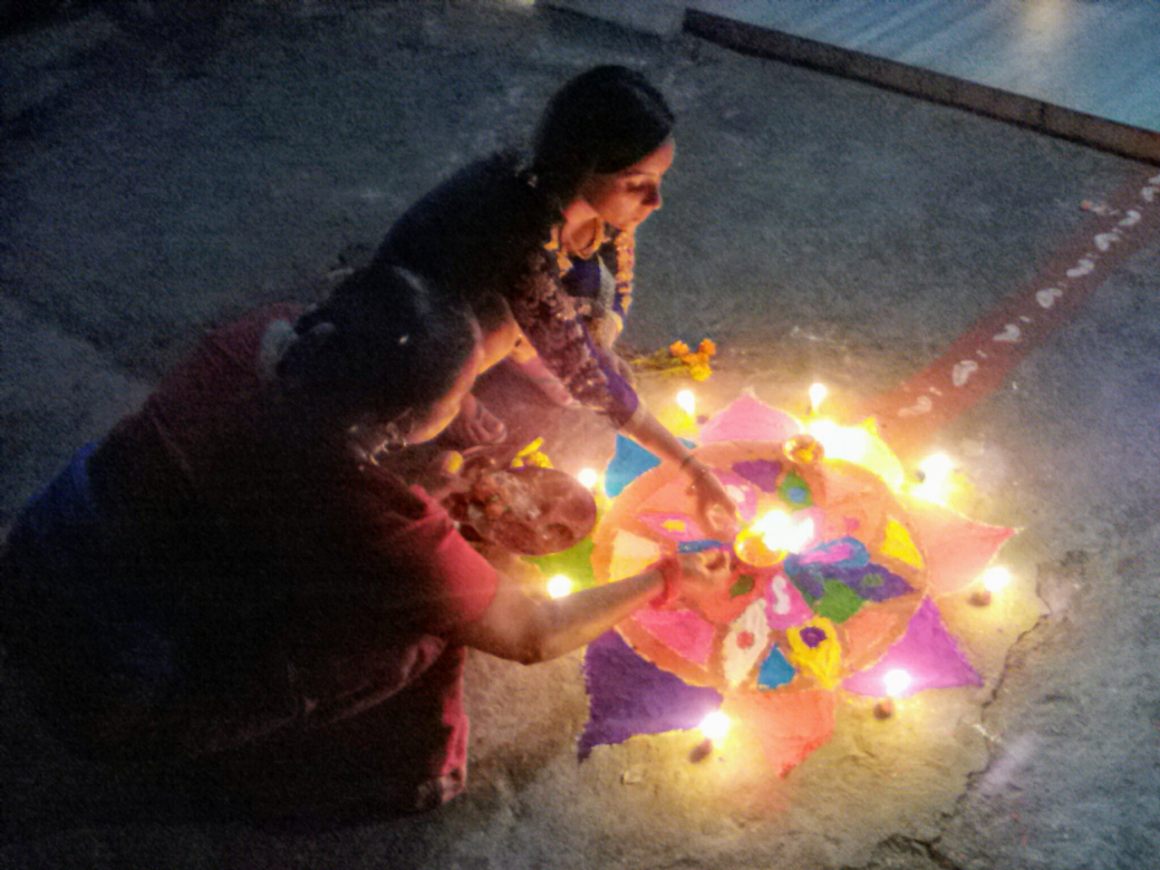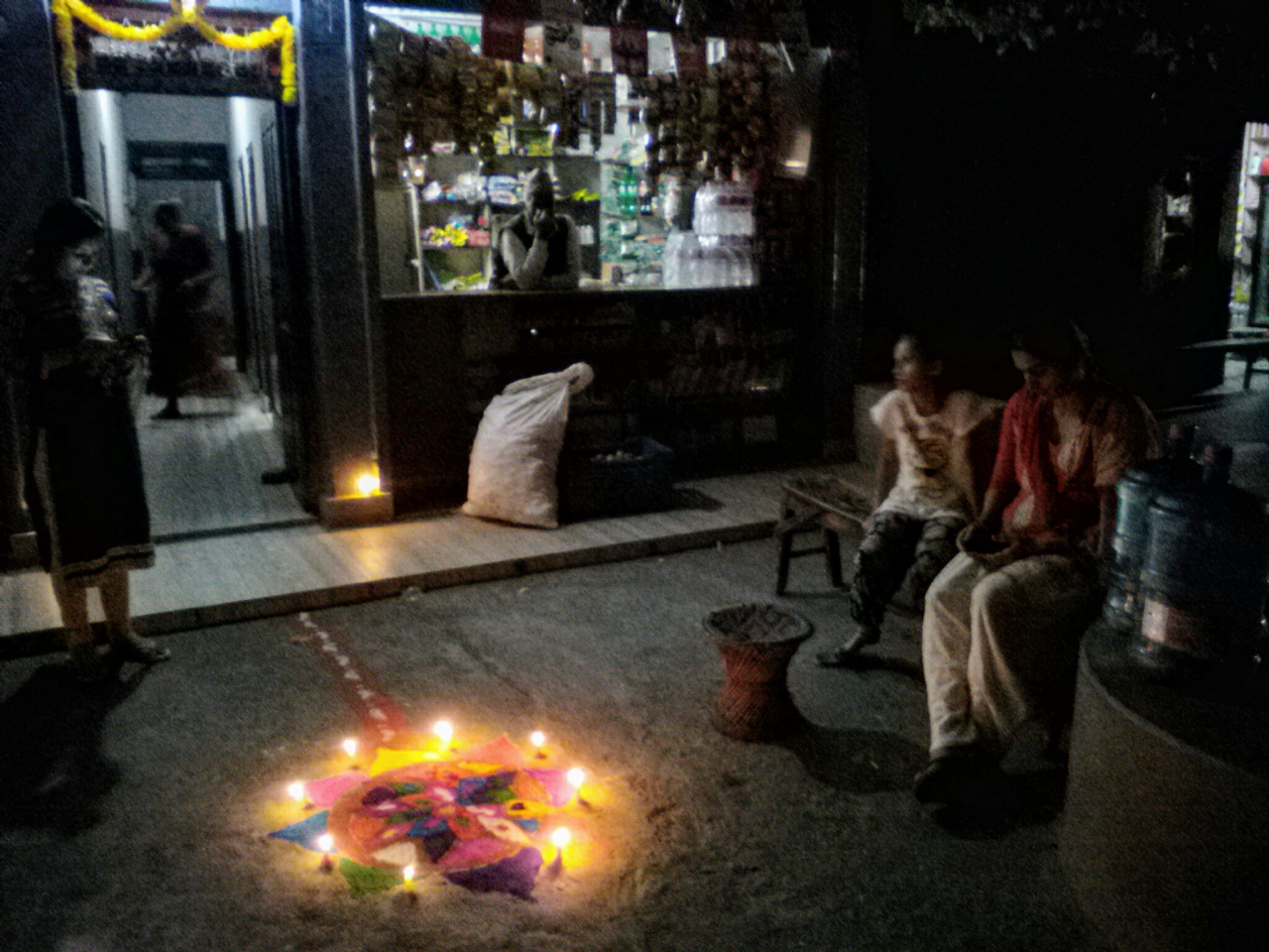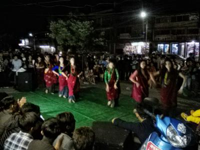 ディーワーリーとはインドで10月〜11月に行われるヒンドゥー教の新年のお祝い。ネパールでそれに当たるのが光の祭りとも言われるティハールです。全部で5日間、カラスや、犬っころ、ウシちゃんたちに食べ物を与え拝み、おでこに赤い粉(ティカ)を付けたりします。ティカを付けられた犬っころのなんともおマヌケでかわいらしい姿は微笑ましいです。ティハールの本番は3日目の「ラクシュミ・プジャ」と呼ばれる日。お金の女神であるラクシュミを家に招くために家の前にティカで絵を描きろうそくを灯します。なんとも幻想的で光の祭りと言われる所以です。祭りの間は各家々にカラフルな電球が吊るされ、子供たちはお菓子やおこづかいをねだり近所の家々をまわり、大人は道端で音楽を鳴らし踊っている。派手さはありませんがとっても楽しいお祭りです。