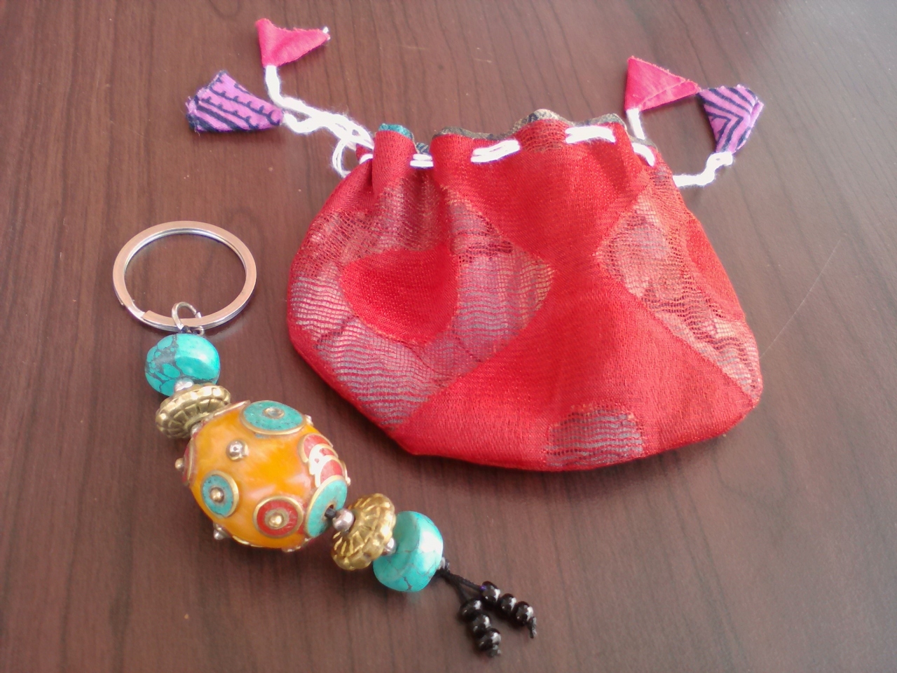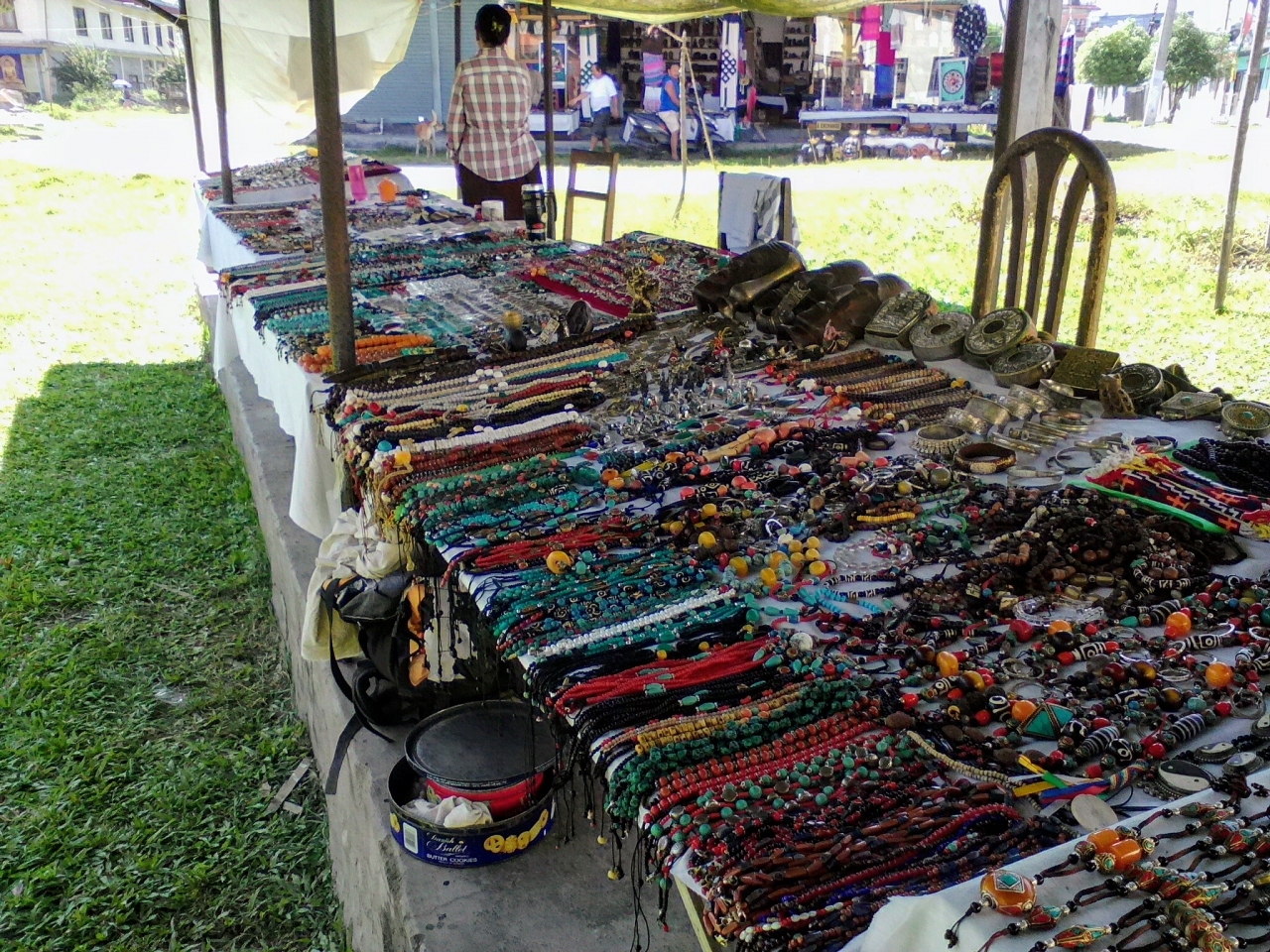 草の生えた広場に店を広げています。ほのぼのした感じですが買い物はそう簡単にはいきません。かなりの交渉、駆け引きが必要なのでお値打ちに買いたい方は覚悟しておいて下さい。事前の相場リサーチはマストですので…。私はキーホルダーを買うつもりでしたが1個ではなかなか値引きしてもらえず交渉決裂。で、結局まったく別の場所にいたチベットのおばちゃんから買いました。場所はバスンダラ公園と駒ヶ根友好公園との間にあるフイッシュテイルロッジへの渡し船乗り場。大きな木の下で露店を広げているおばちゃんがいます(毎日いるかどうかは不明)。品数は多くありませんがこのおばちゃんの方が交渉しやすく安くなります。写真のキーホルダーを200Rsで買いました。しかも小さな巾着袋のおまけに付き。