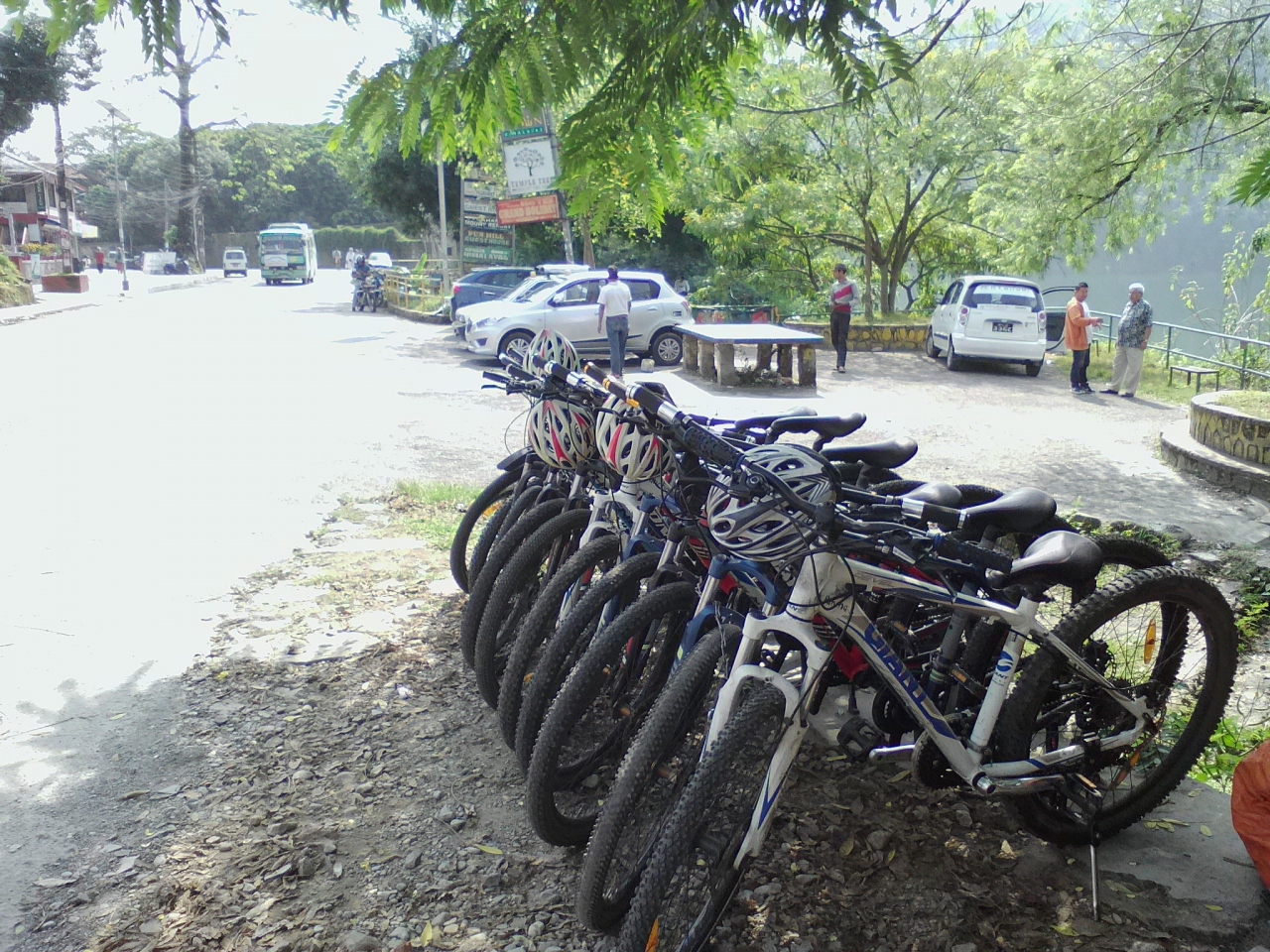 バスンダラ公園から旧国王別荘地までのレイクサイドロード沿いに自転車を並べたレンタル屋が何軒かあります。以前あったママチャリタイプは姿を消し、全てマウンテンバイク。ボロめのものから新しいものまでありますが料金は一律1日500Rs(400Rsに下ったところもあった)。朝から晩までですが時間は店によって変わります。1時間150Rsでも借りられます。