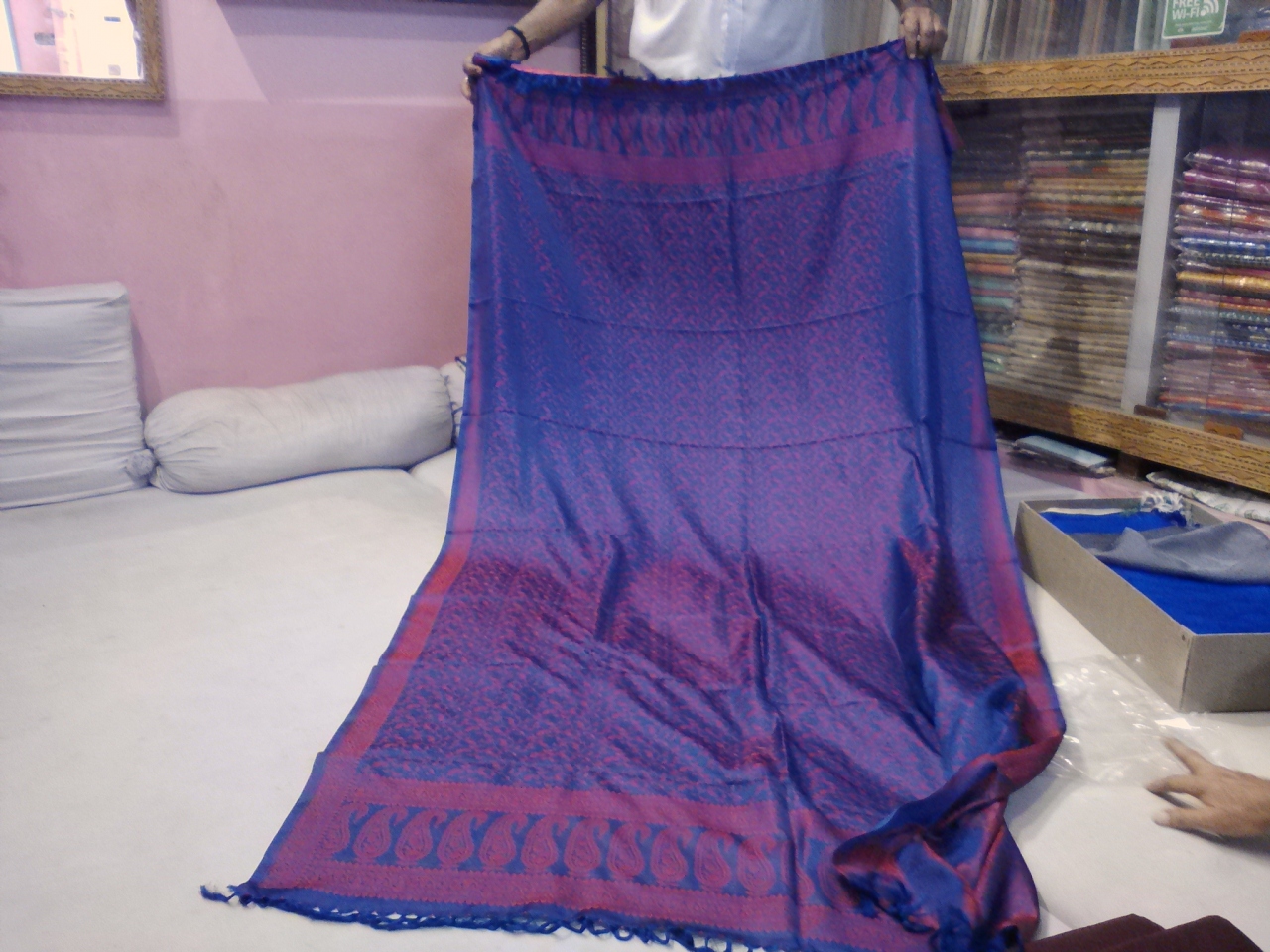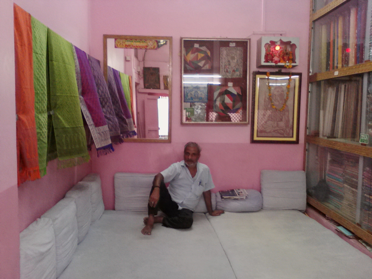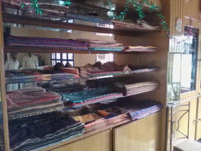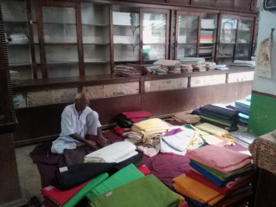 落ち着いたシルク専門の販売店。店や店主の雰囲気も落ち着いており、職人気質、真面目さが伝わってきます。絶対売ってやろうというガッつきはまったくなく、ショップという言葉より販売店が似合っています。店の壁にはサンプルとなる500Rsから1500Rsのシルクストールが掛けられていますが、素材、品質はすべて同じ、大きさによって値段が変わるというシンプルさ。棚にはサリーやベッドシーツ用の生地が仕舞われていますが1mあたり○○Rsという値段表示も書いてあります。また壁にはパスポートケースやレターホルダー、クッションカバーのサンプルも掲げられていました。もちろん値段表示あり。明朗会計的な印象でわかりやすい。とても好感が持てる店です。
