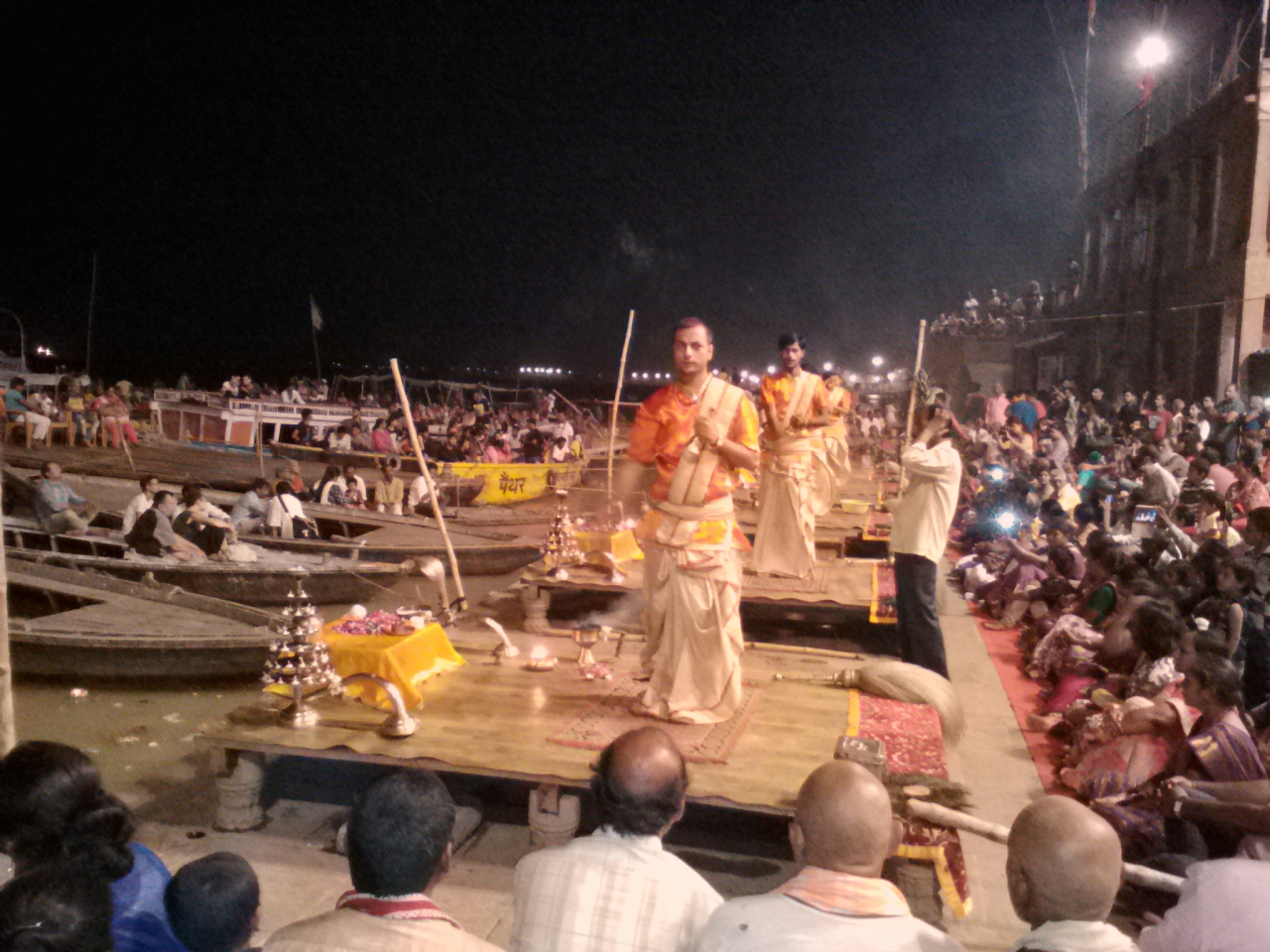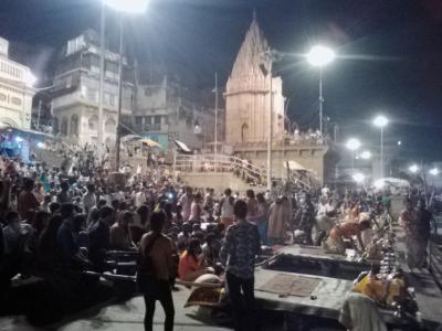 ダシャーシュワメガートで毎日、日没時頃(この時期は18:30頃)から始まります。祈りの儀式ということで神聖で厳かなものを想像していたのですが、かなり違いました。流れている曲調もわりとポップなもので川べりには見物客を乗せたボートがぎっしり、ガートガート側では多くの人々がカメラやスマホを掲げている。まるで観光客用のアトラクションです。かなりの興ざめ。わざわざ観光客見せるためにやっているように思えてきます。1時間ほどの儀式ですがショーを見るつもりで行って下さい。