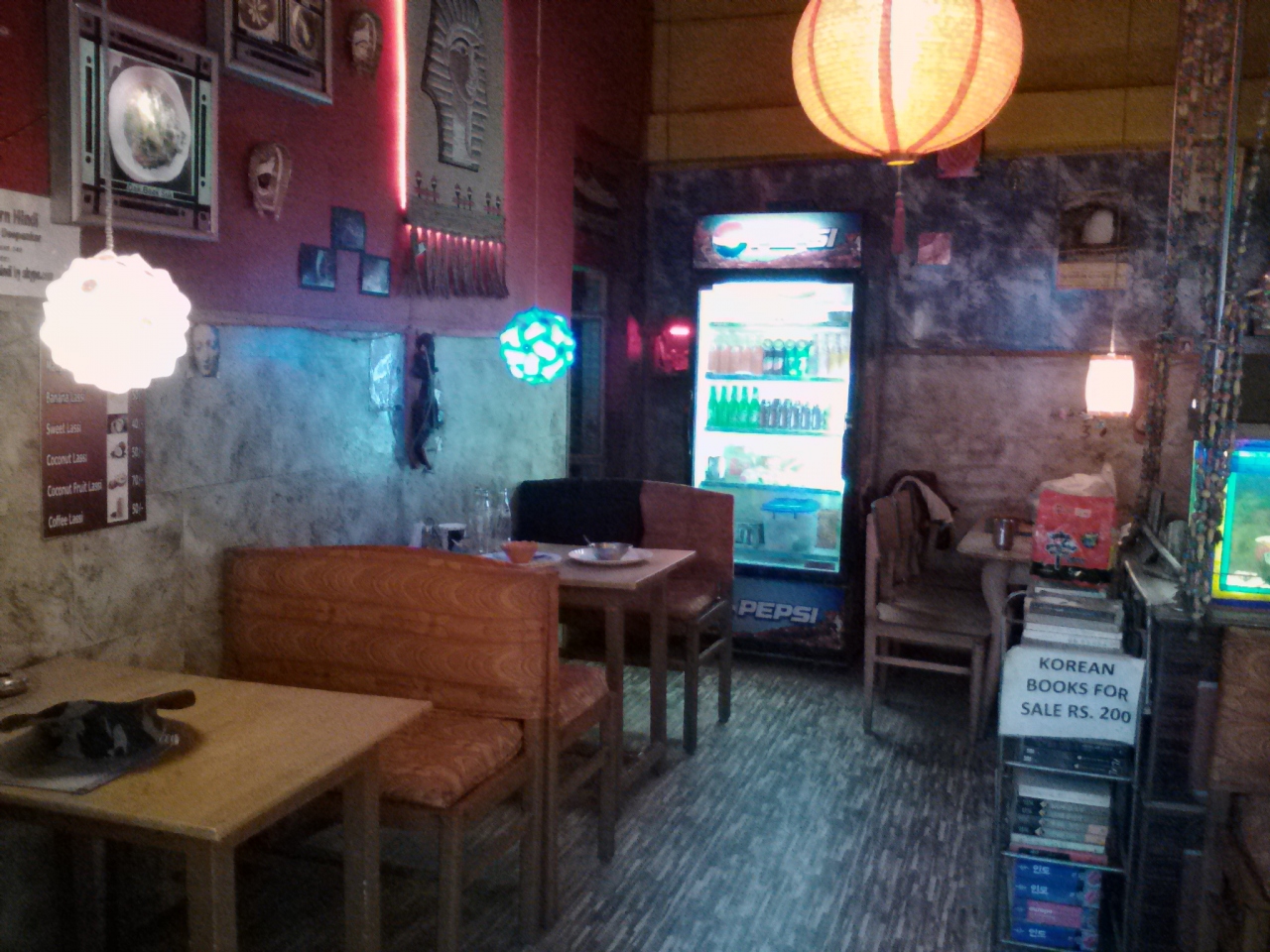 腰布一丁の半裸のサドゥ一歩手前の人が料理を作ってました(この日だけだったかもしれませんが)。一応ツーリストレストランなのにこれってどうなんでしょうか?インドならまあありかもしれません。しかし仕事が遅い!マカロニ トマト ソース(90Rs)をオーダーしましたがかなり待たされました。さて料理ですがなかなかのボリュームで味も何となく悪くはないように感じましたが途中で気持ち悪くなって食べきるのがかなり辛かった。ということはやはり何か一味違ったのでしょう。この店は日本食はありませんが韓国メニューがあり店内にもいつくかハングル文字が…。韓国の中古本も売っています。韓国好きのレストランです。