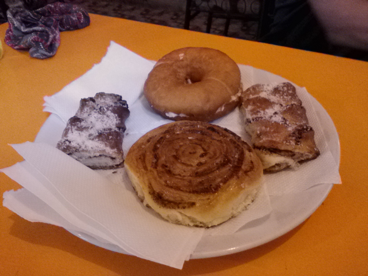 朝食を食べに行きました。ジャーマンベーカリーともうたっているので(バラナシには数多くありますが…)、パンを食べることに。この日は全8種類。の中から「Cinnamon Roll」「Cream Dougnut」「Chocolate Bracket」をチョイスし2人でシェアしました。すべておいしくてお値段もすべて25Rsとリーズナブル。もちろんちゃんとした食事もできます。他のレストラン同様、各国の料理が揃っています。日本食ももちろんあり「Shogayaki Set(145Rs)鶏肉使用」「Karaage Set(150Rs)」にはみそ汁、ゴマあえ、ティーが付いています(食べてないので味の保証はしかねますが…)。他に変わったところではトムヤムクンやグリーンカレーなどのタイ料理もあります。