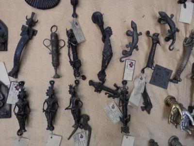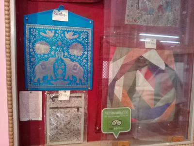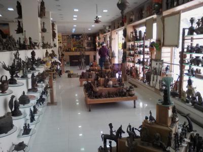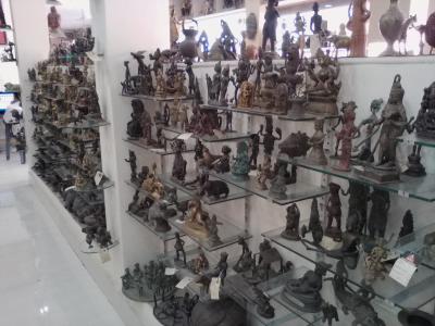 外観はちょっと入りにくい感じ。一度入ったら何か買うまで出られないブラックショップ的な雰囲気を醸し出していますが全くそういう店ではありません。この店は地元のアーティストを支援し活躍の場を与える活動をしており、店内にある商品はすべて地元のアーティストが製作した物(らしいです)。そういう作品的な製品の性質から値段はあってないようなもの。絶対的な価値などありません。自分が気に入って納得いく価格なら買うという気持ちが必要です。ブロンズや銅の仏像や壺などが多いです。小さいものなら1000Rs以下のものがいくつかあります。アジアチックなドアの取っ手や壁に掛けるフックなどは実用性があり自分用のお土産にしてもなかなか面白いと思います。