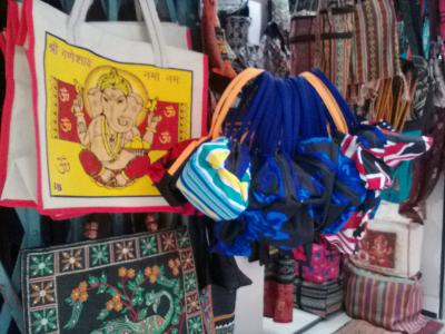 主に布物を扱うツーリスト用のお土産ショップです。品数はかなりのものです。例えばシンプルなTシャツなら70Rs〜、神様Tシャツは250Rs〜。コットンのアリババパンツ150〜、ブッダやガネーシャがプリントされたバッグ50Rs〜などなどなど。とにかく種類が多い!いろいろ選べます。