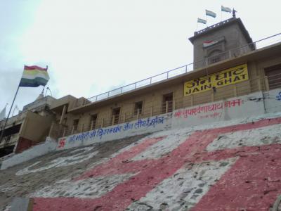 ガートの上にはジャイナ教寺院があり脇の階段を上り小道を回り込めば寺院内に入れます。快く招かれますが後でドネーションを求められます。まあ、これは“気持ち”ですから自分の払える額だけ喜捨すればいいと思いますが、どこからか若者がやって来て100Rs払えと言ってきました。もしこんなヤツに出会っても取り合う必要はありません。無視するかやり過ごして下さい。ガートの形状からか寺院からはそれほど眺めはよくありません。