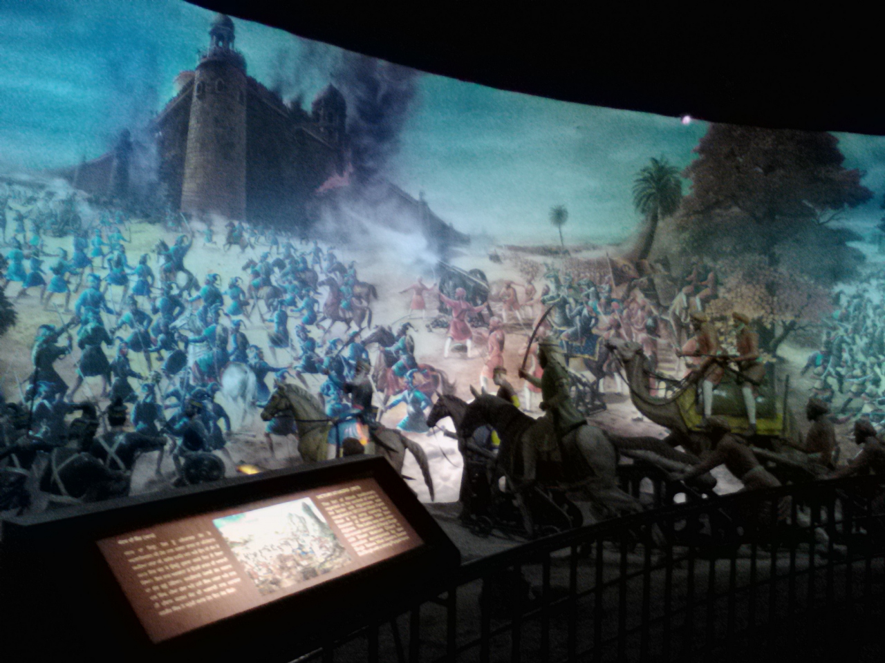 アムリトサル駅の北東約1km、Ram Bagh(Google MapではCompany Bagh)内の北西角にあるミュージアム。現在の名称は「Maharaja Ranjit Singh Panorama」といいます。入場料は10Rs。歴史上の英雄ランジット シン王(Maharaja Ranjit Singh)の功績を称え、それを紹介する展示がされています。まずは1階、王の生涯を紹介したジオラマルームが2つ。そして王の軍隊が使用した18〜19世紀頃の銃や剣、槍、鎧などの展示。ほとんどが本物でかなり見応えがあります。そしてメインである2階は勝利をおさめた数々の戦いを実物大のジオラマでパノラマ的に再現しています。効果音もありでかなり力を入れて作ったのはわかるのですが若干残念な雰囲気もあり、見る人によって評価は分かれるところだと思います。いずれにしても10Rs以上の価値はあるミュージアムだとは断言できます。