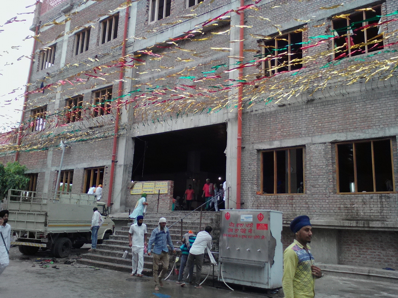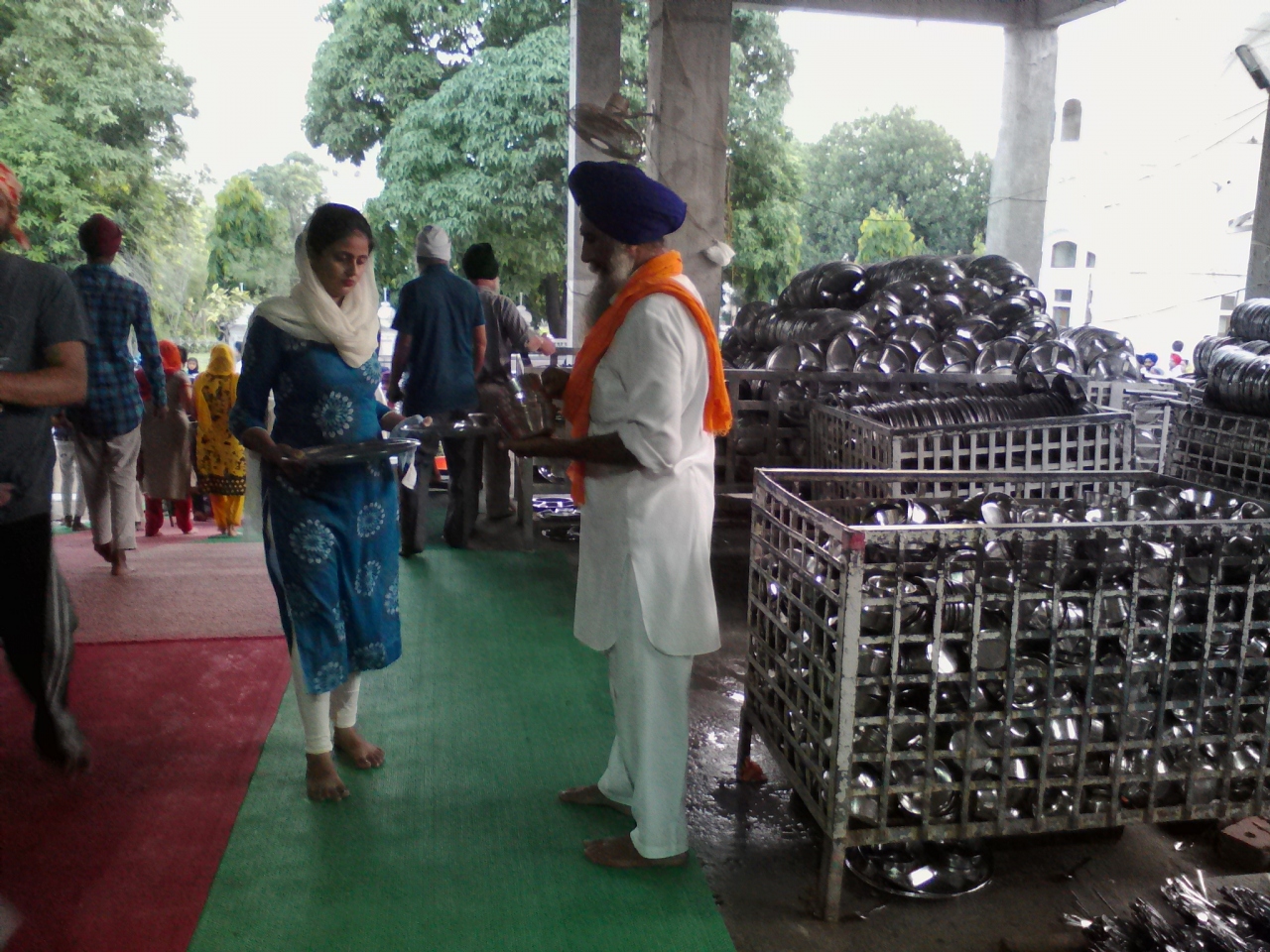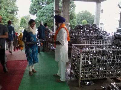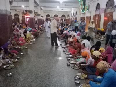 ゴールデンテンプルを訪れた巡礼者に食事を振る舞う食堂。もちろん異教徒であれ外国人であれすべての人が利用することができます。料金はかかりません(ドネーション可)。初めて訪れた方は戸惑うかもしれませんのでシステムを紹介します。正式な入口はゴールデンテンプル側ですがその反対側の道路側からも入れます。道路側から入った場合を説明します。まずは靴を預けます。専用の預け場所はないので入口脇に置いておくか、ゴールデンテンプルの靴預け所を利用します。最寄りの靴預け所は道路側入口向かって左50mにあります。中に入るには髪を隠さなければいけません。階段を上がった所に置いてあるHenky(布)を借りられます。しかし汗臭く汚れているものもあるので自分で用意した方がいいかも。町中で10Rsで売られています。