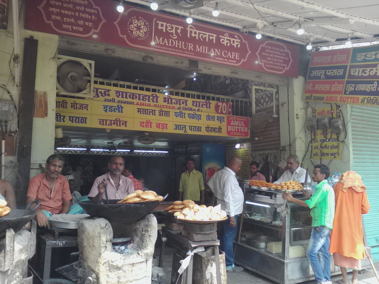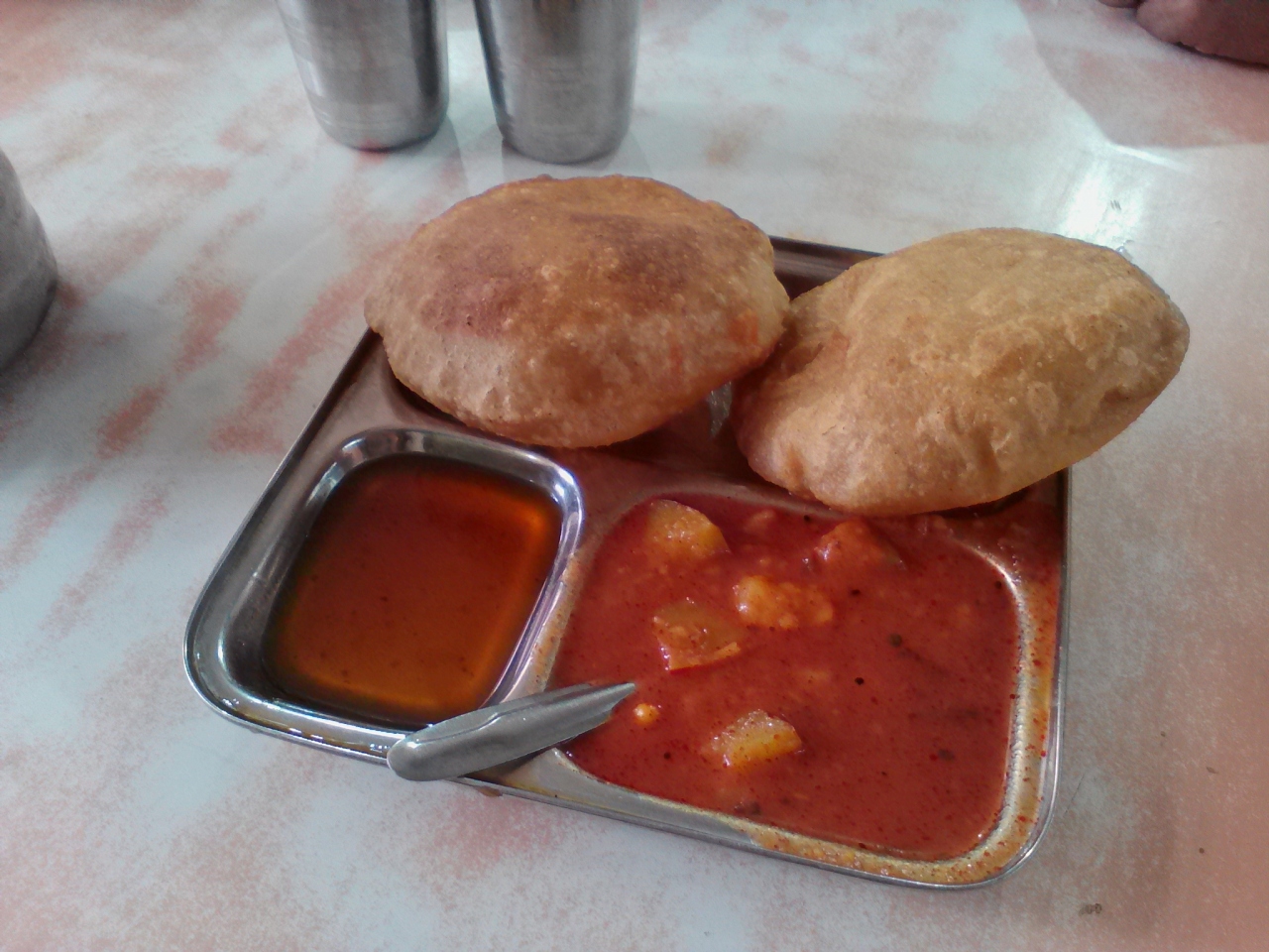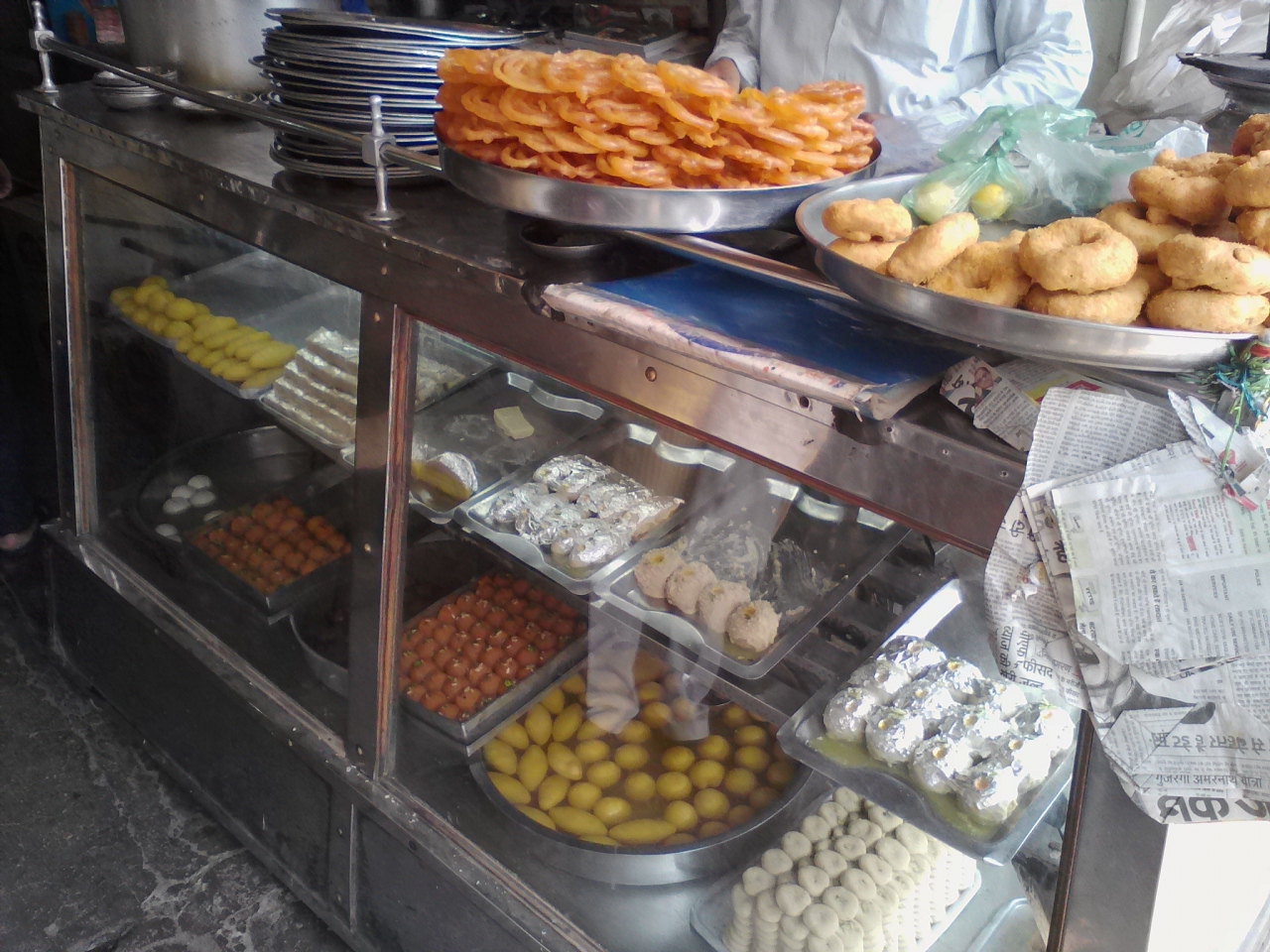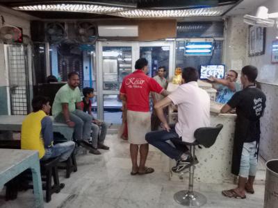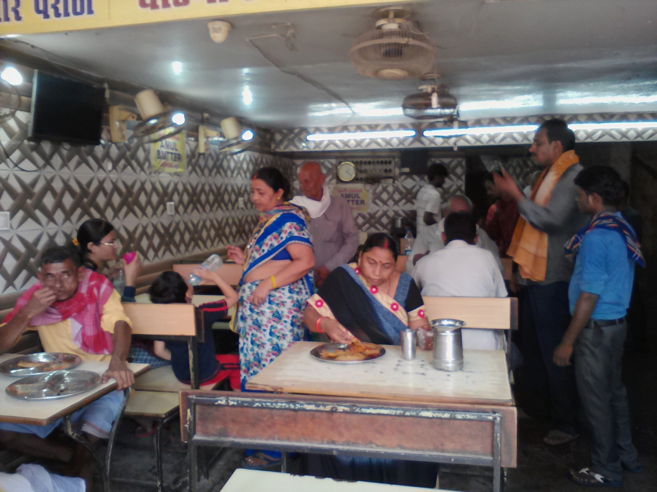 気軽に入れるスイーツ、スナック類もあるローカル食堂。13:00頃行きましたが結構な混雑ぶり、席が空いてなくて相席になりました。軽めに食べたかったのでプーリー2枚をオーダー(店先で揚げているので指を指しただけ)。間もなくしてプーリー2枚とかぼちゃのカレー、甘いシロップのようなものがプレートに乗せられやってきました。これで30Rs。食事というよりはおやつみたいなもんです。周りを見るとターリー(70Rs〜300Rsまでの4種類)を食べてる人が多かったです。食後のデザートとしてでしょうか、スイーツ単品の人もいました。おやつから食事まで手頃な値段で食べられる重宝する食堂だと思います。