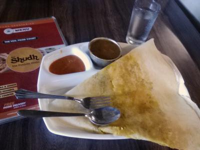 騎馬像のあるフワラチョークにあるカジュアルなベジレストラン。フードコートっぽい造りになっていますがフードコートではありません。ちゃんと席に案内されオーダーを取り席まで料理を運んで来てくれます。店内は古き良き昭和の香りがぷんぷん。イスやテーブル、内装などがまるで純喫茶のようでもあります。メニューはパンジャビ料理や南インド料理、ピザ、パスタ、スナック類など。南インド料理であるマサラドーサ(100Rs)を注文してみました。ドーサ特有の酸っぱさは控えめで食べやすくなかなかおいしかったです。会計は税込118Rsでした。