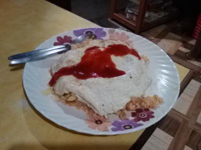 まさにパッとしない、いかにも流行ってなさそうなツーリストレストランです。入るのをためらう人がほとんどではないでしょうか。そこをあえて“潜入”してみました。メニューには日本食の欄も。しかし、この店の雰囲気からしてどれも地雷度が高そうに思えたので値段的にもリスクの低そうなオムライス(90Rs税なし)をオーダー。店員が運んで来たときに「いただきます」と言われました。お前が食べんのか?というツッコミはおそらく理解されないだろうと思いやめときました。料理はオムライスというよりは目玉焼きオン・ザ・ケチャップライスという感じ。目玉焼きといっても肝心の黄身の部分が見当たらず全部白身に見えました。謎です。味は…いまふたつ。ケチャップライスがかなりオイリーでご飯の臭いもきつく、かなり無理をして食べきりました。見た目通りのイケてないレストランです。