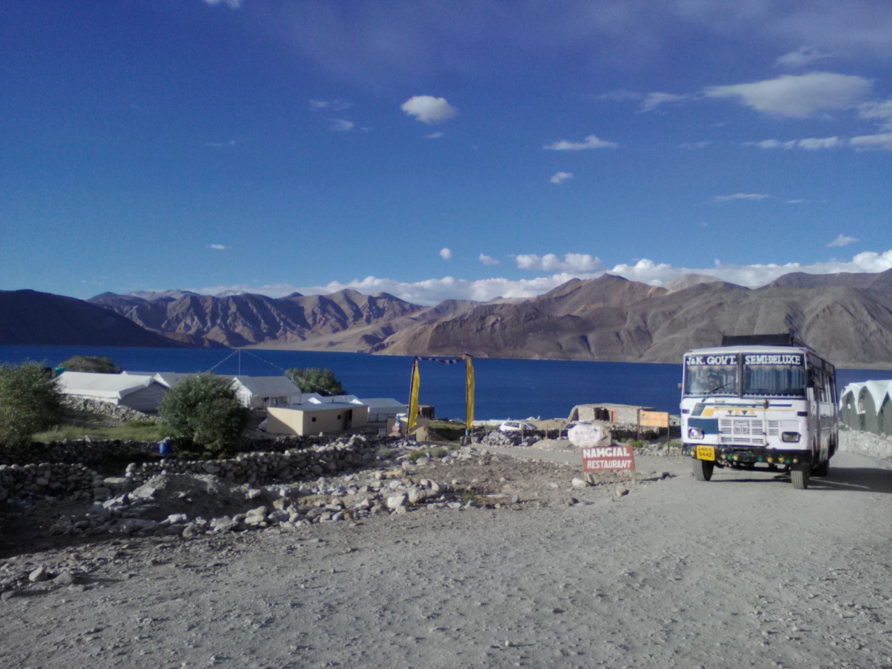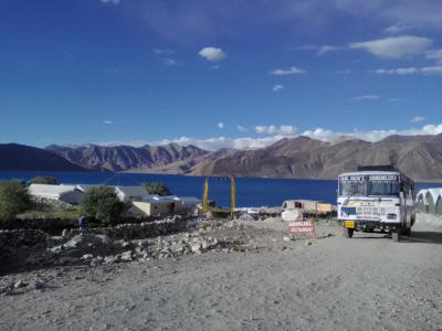 パンゴン湖へ行くには旅行会社で車をチャーター(シェアも含む)するかローカルバスを利用するかのどちらかになります。ローカルバスはバススタンドから月、火、木、土の朝7:00出発。270Rs。チケットは事前購入可能。帰りはそれぞれのバスが翌日(火、水、金、日)の朝7:30に折り返します。