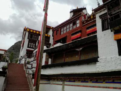 デスキットでのバスの乗り換え時間の間に行ってみました。バススタンドから見るとかなり山でしたが徒歩でチャレンジ。1kmちょっと歩くと登り口である門が現れます。くねくねとした自動車道続いていますが、ちゃんとショートカットできる小道もあります。どちらが楽かは別にしてもちろん小道をチョイス。白い仏塔が並ぶ脇を歩き自動車道に戻るとその先にチケット売り場(30Rs)があります。最後の急な坂を登ればゴンパに到着です。