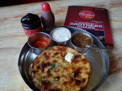 この店の看板商品?である「スペシャル アムリトサリ クルチャ(Special Amritsari Kulcha)」を食べに行きました。これは朝8:00〜昼12:00までの朝食限定メニューで価格は75Rs(税込89Rs)、午後以降は85Rs(税別)になります。内容はクルチャ、チャナ、カード、サラダ。チャナはダルに似たカレーですがなんとなく日本のカレーのようでなかなかイケます。カードはプレーンヨーグルト、サラダ(と呼ぶにはショボい)もクセがあまりなくまずまず。で、クルチャもおいしー!かったのですが上に乗っているバターが効きすぎで食べ終わったときには気持ち悪くなってしまいました。バターは半分くらいにした方がいいかもしれません。
