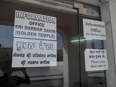 ゴールデンテンプル正面の建物、入口に向かって右方向にありますが現在建物を改修中のため場所が移っています。入口の広場と噴水を挟んだ対面の商店の間にあります。これは改修工事中の間の仮オフィス。2017年11月頃には元の場所に戻るそうです。仮オフィスを覗いてみましたが机とイスがあるだけで超簡素、その中におやじが3人。地図やパンフなどは見当たりませんでした。どれだけ情報がもらえるかははなはだ疑問です。8:00〜20:00(毎日)