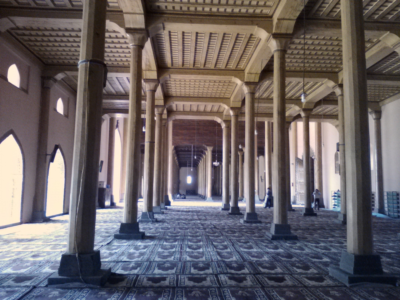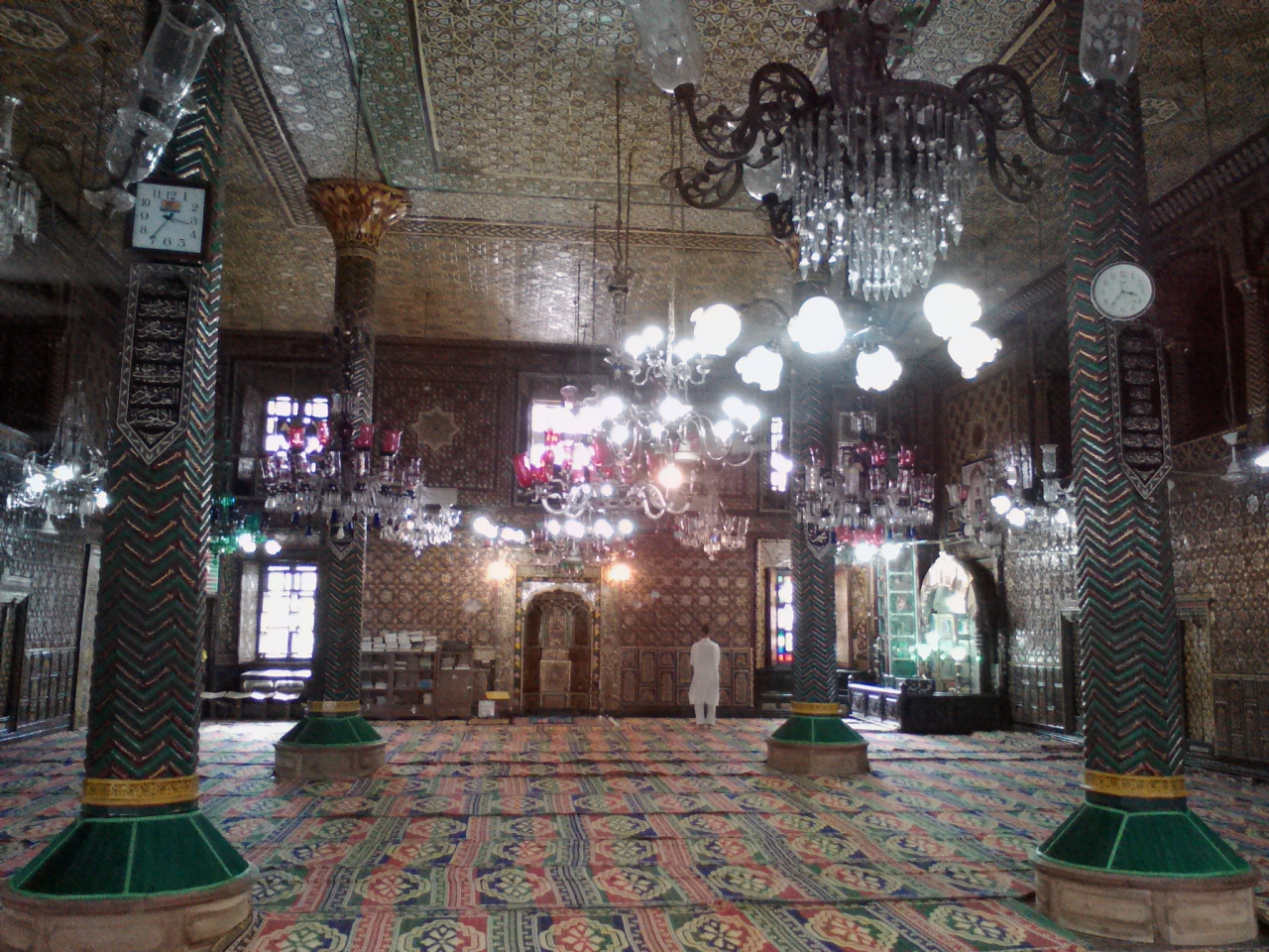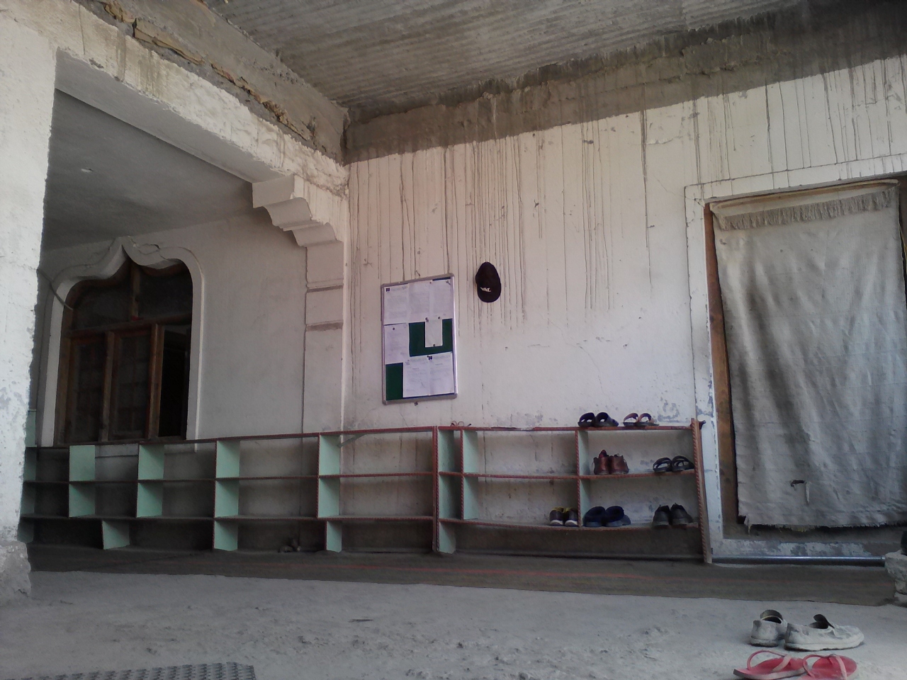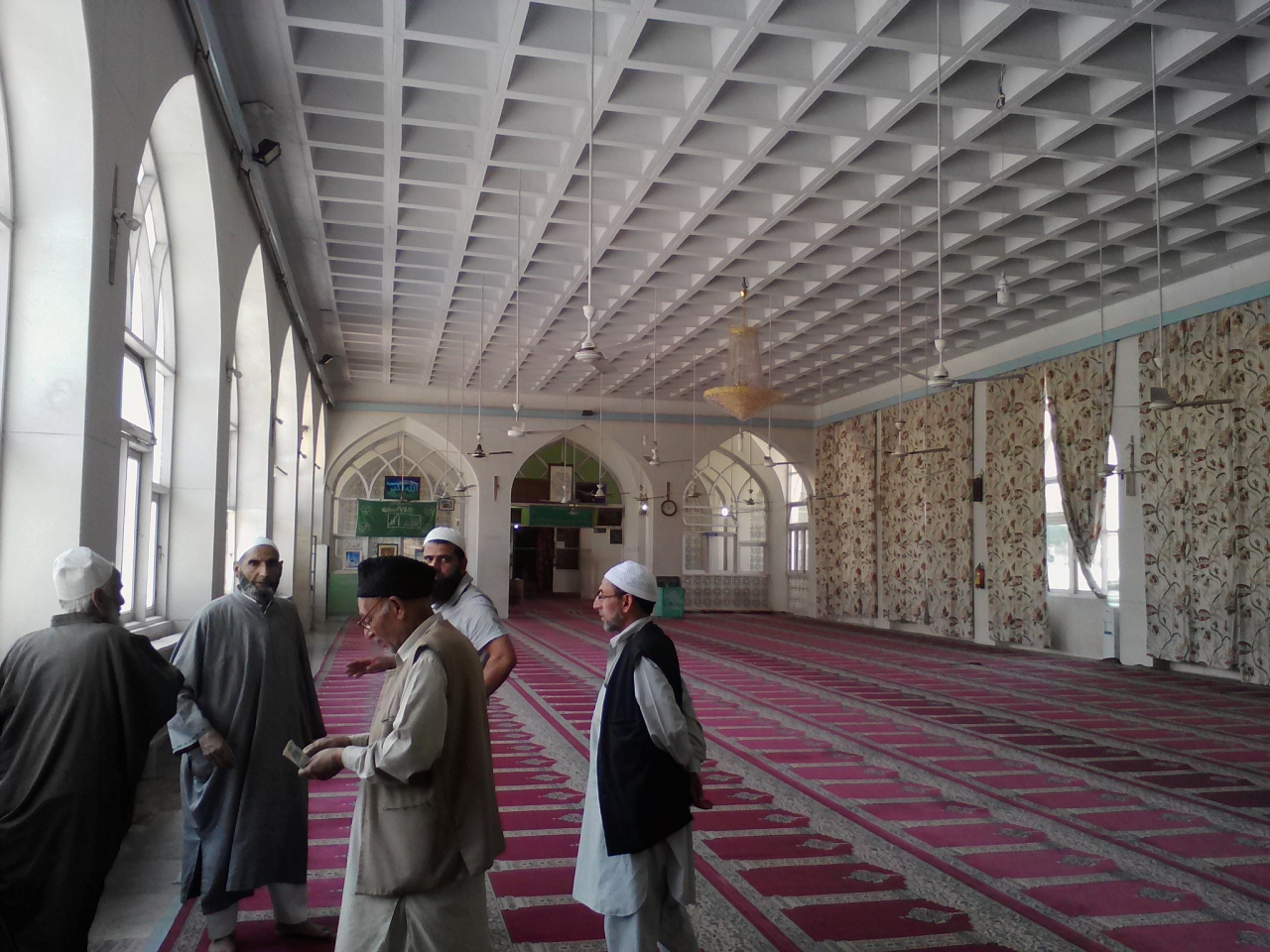 現在、拡張工事中?のためメインバザールの北の突き当たりにあった正面入口が使えません。仮の入口はその突き当たりから右にある「WELCOME TO OLD TOWN MARKET」と書かれた小道を入り20mほど進んだ左手にあります。本来は裏口ではないかと思われます。階段を上がると下駄箱があり、その横の布のかけられたところを入ると礼拝室です。異教徒である私も入室を許可され中を見学できました。