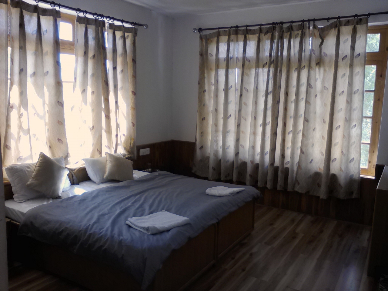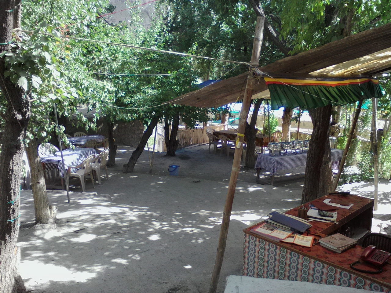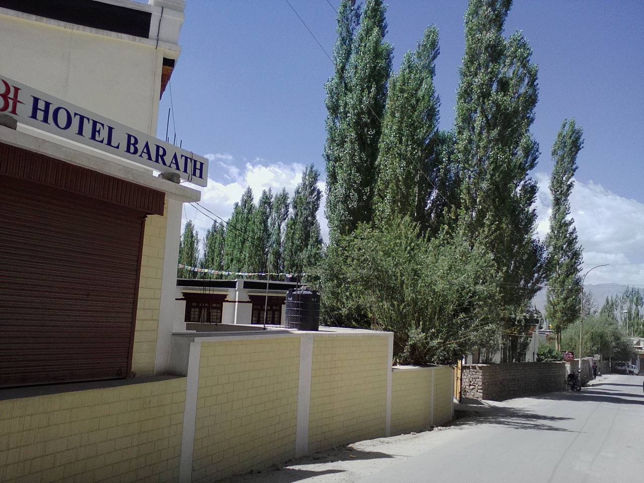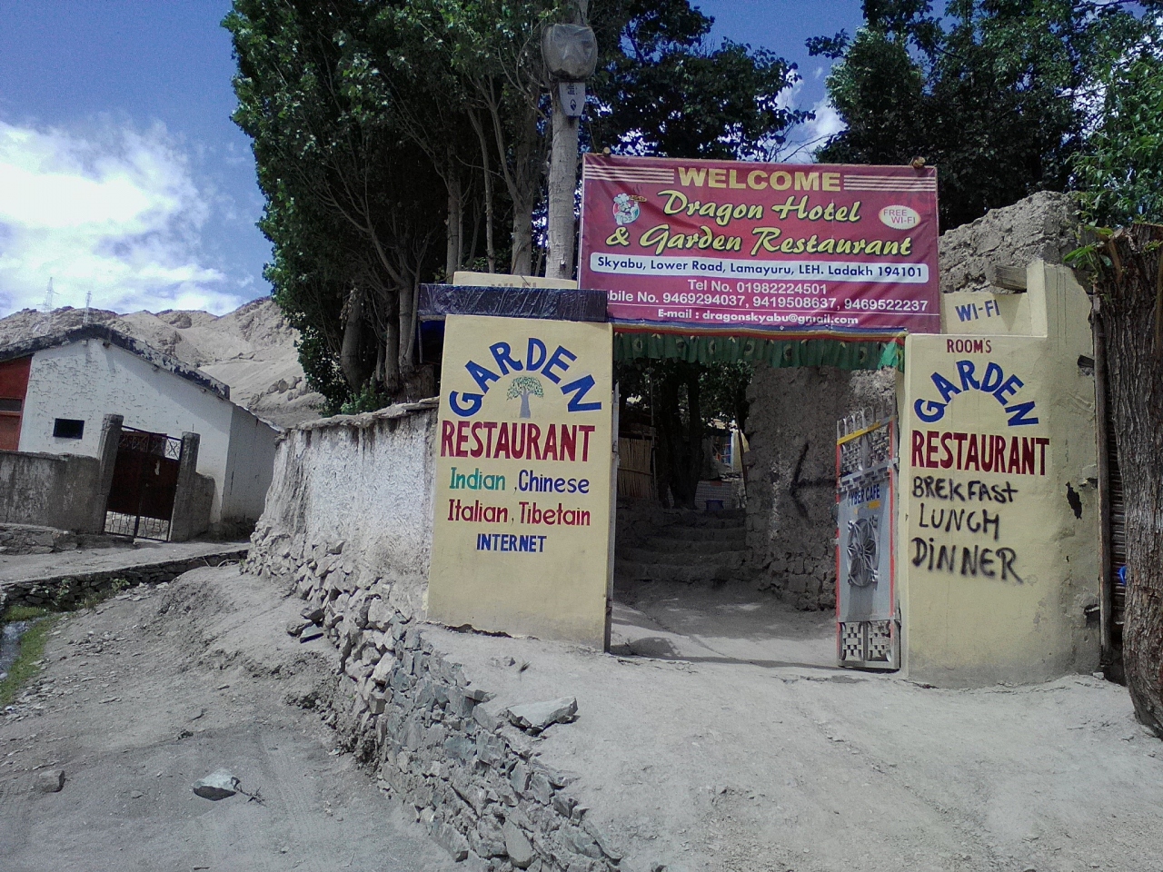 バスが停まるほぼ真ん前にあります。「Dragon Hotel & Gerden Restaurant 」。安い部屋がいいというと同じ敷地内の奥の建物に案内されました。しかしそこには「TASHI HOME STAY」の看板が…。どうもオーナーが同じでドラゴンホテル系列のようです。一番安い部屋は200Rs(もっといい部屋もあります)。ダブル、共同トイレ、シャワー。部屋自体はひどくはありませんが共同シャワーはお湯は出ません。バケツでお湯をもらえるサービスもありません。トイレ、シャワー付きの部屋はソーラーのお湯が出るらしいです。一応Free Wifiですが私の泊まった日は停電だったので19:00まで使えませんでした。その後もほとんどつながりませんでしたが…。毎日かどうかは不明。