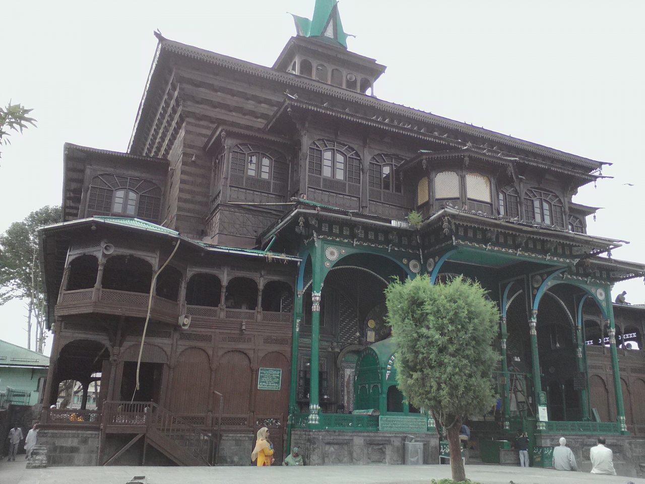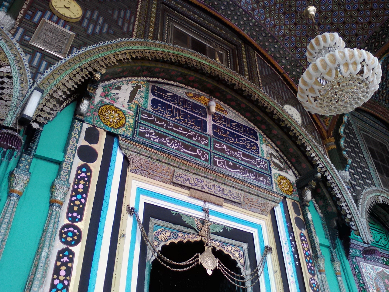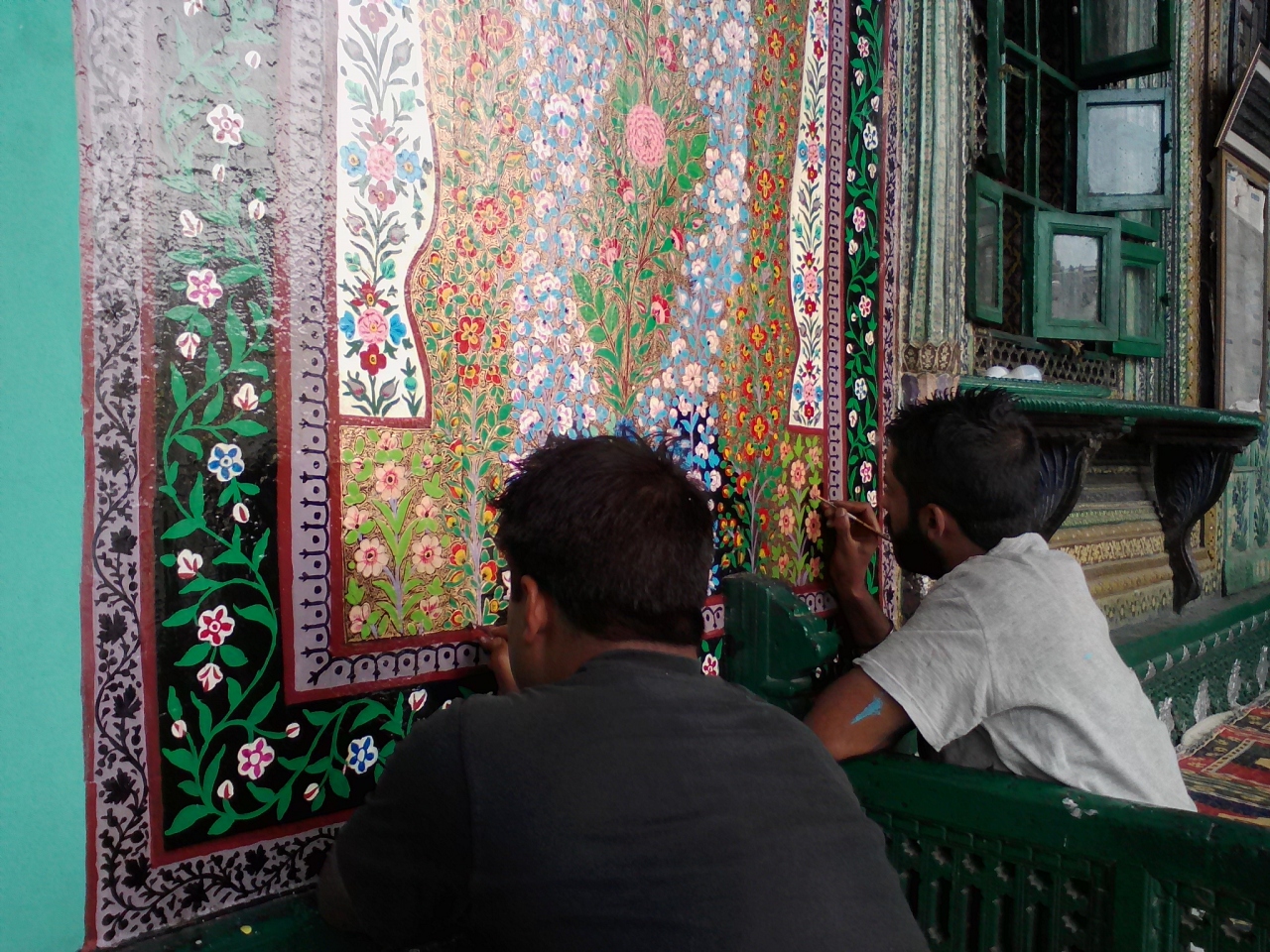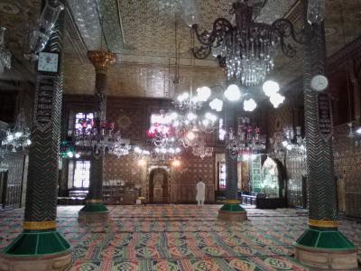 このモスクを初めて見た方は思わず声をあげるんじゃないでしょうか。モスクらしくない…、おとぎの国か絵本の中に出てくるお城のようでもあります。かわいらしくもありシブさも感じられます。近づくと細工の細かさにびっくり。一部改修中のようで壁画を描いていました。これもまた見事な美しさです。見学は無料ですが異教徒は内部に入ることができません。入口にある柵から覗けるだけです。しかしこれまたすごい。豪華なシャンデリアがいくつも吊り下げられており、まさに異空間です。モスクの外側は一周できます。カシミールの彫刻技術も堪能できます。