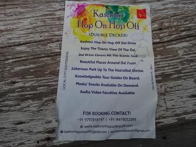 バスの名前は「Hop On Hop Off」。赤色の2階建てバスです。乗り場はネルー公園近くのブルーバードロード沿いにあるのZaberwan Park。毎日16:00発、400Rs。4hかけてチャチュマシャヒ、ニシャット バーグ、シャリマール バーグ、ハズラトバル モスクを回ります。詳細、予約は写真を参照して下さい。