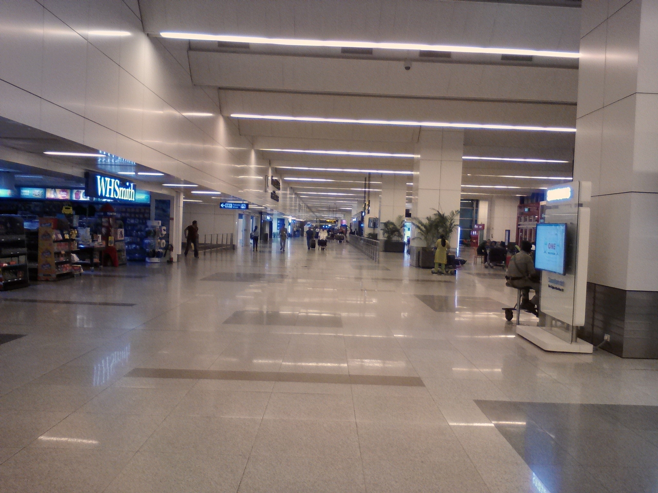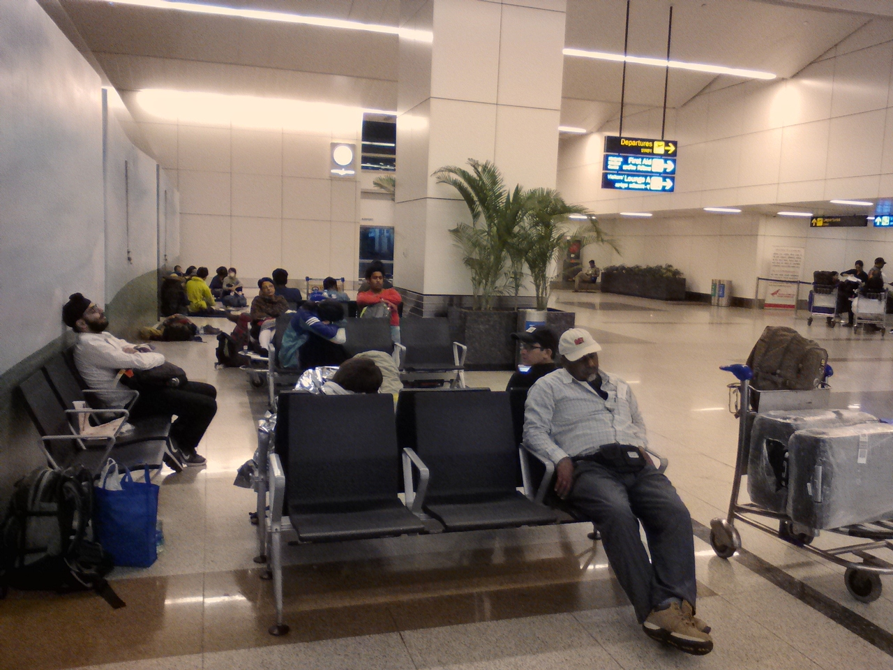 北京からのフライトが深夜1:30着で朝まで空港内で過ごしました。預け荷物を受取るbaggage claimのところにもベンチがありますがごくごくわずか。なので税関を抜け到着ロビーに出た方がいいです。深夜ならそれほど混んでいないのでベンチも空いていると思いますし、ロビーの端に行けば床に横になれます。 一般のインド人はここには入ってこれないので静かで安全です。しかし利用客であっても一度ロビーから外に出てしまうと再び入ってこられません(100Rsのビジターズチケットを買えば入れますが…)。外にもベンチはありますがA/Cなしでウザいインド人がウヨウヨいてはたまりません。その時は出発フロアへ上がって下さい。もちろんチケットを持っていないとロビーには入れませんが1~8まである入口の両端にビジターズラウンジA,Bがあり一応建物の中には入れます。100Rs払えば正式なラウンジに入れますがその必要はありません。手前にもスペースがあるのでそこで過ごせます。A/Cがあるだけでかなり助かると思います。