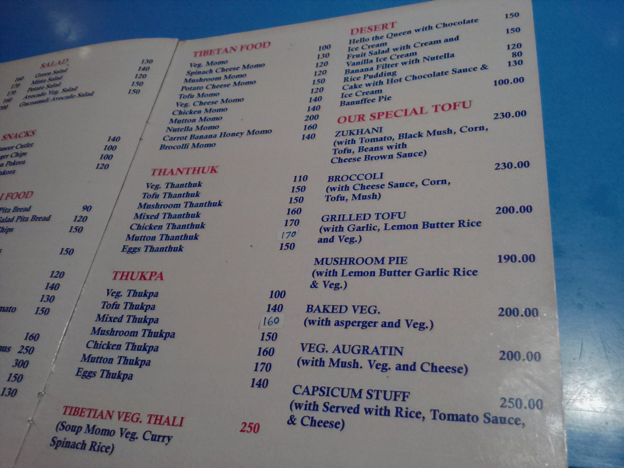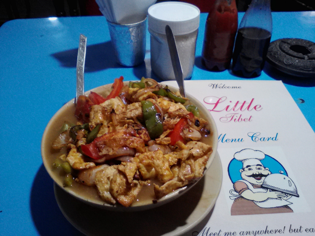 やはり今回もチベット料理、エッグ テントゥク(150Rs)をオーダー。ちなみに3年前はいくらだったのかわかりませんが以前食べた豆腐テントゥクは110→150に値上げされてました。テントゥクで150Rsは、はっきり言って高いと思いますが料理が運ばれてきて少し納得しました。器から溢れんばかりのとてつもないボリュームです。トマト、玉ねぎ、にんじん、キャベツ、ジャガイモ、ピーマン、青菜、カリフラワー、きゅうり、にんにくの超具だくさんです。卵も2個使用するサービスぶり、スープもみそ味風でとてもおいしいです。なんとか食べきり大満足の一品でした。女性2人でシェアしてもいいくらいの量だと思います。