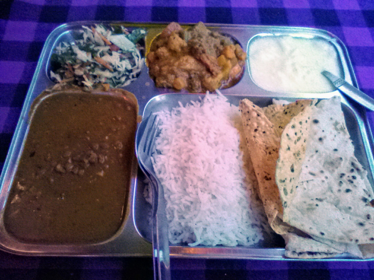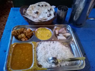 3年ぶりにヴァシシュトを訪れ、このレストランにも行ってみました。もちろん前回と同じ「ベジターリー」をオーダー。前の写真と比べてみるとほとんど同じ。ミックスベジ、ダル、ライス、チャパティ(2枚)、パパド、ヨーグルト。